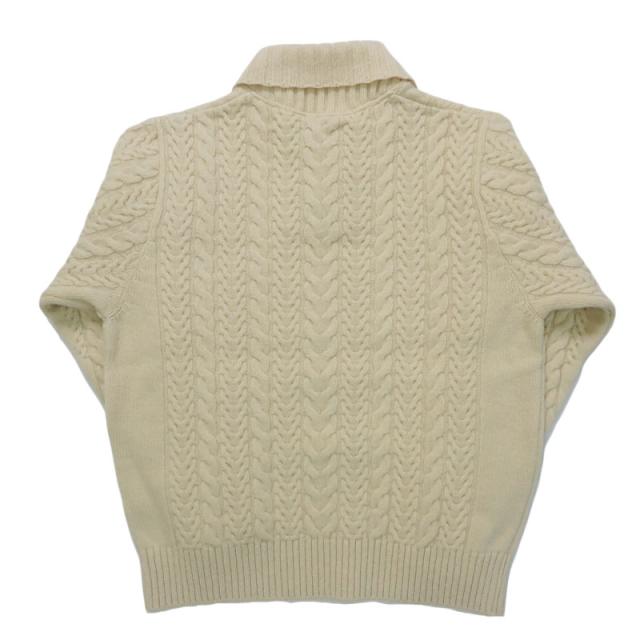 上質で厚手のケーブル編みニット生地に、ショールカラー、ボタンはナットボタンを使用。