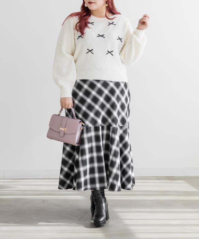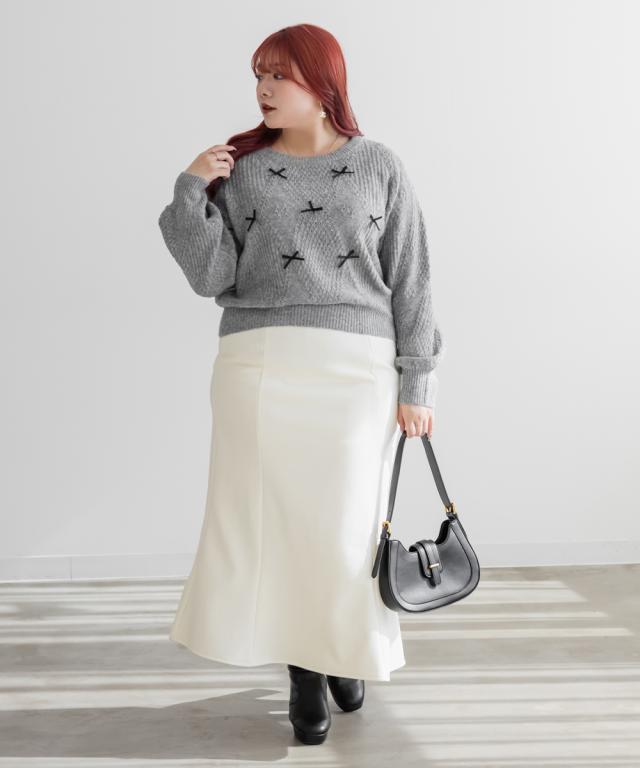 | 3Lサイズを着用してちょうどいいサイズ感でした。程よい丈感でトップスインしなくても着られるのが魅力です◎リボンがたくさんあしらわれたデザインで、ガーリーコーデにぴったり!1枚でかわいくなれるので、シンプルなボトムスとコーデするのがおすすめ!コートなどのアウターとも重ねやすいです! |