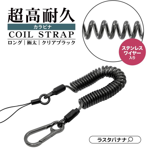 スマートフォン 携帯電話 落下防止 紛失防止 ストラップ ワイヤー入り 超高耐久 カラビナ コイルストラップ 極太 ロング ブラック RCSTWCL04BK ラスタバナナ