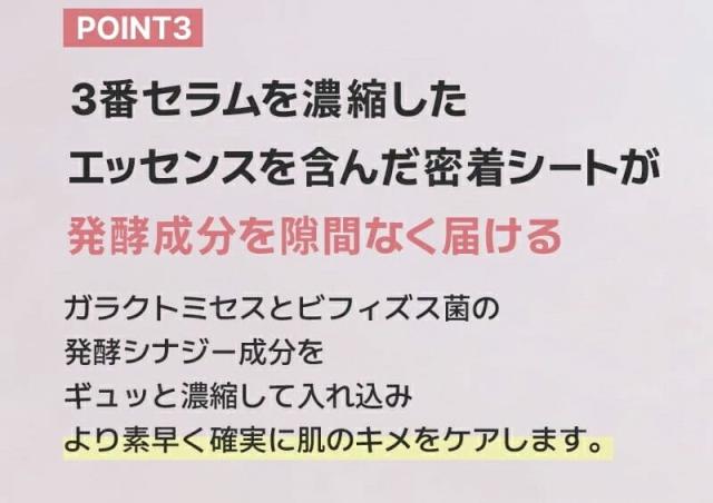 ナンバーズイン人気の3番シリーズ商品。 高価な発酵成分と毛穴収れん成分を配合し、たった1回使うだけで、肌のキメの変化が実感できる集中キメケアシートマスクです。 |