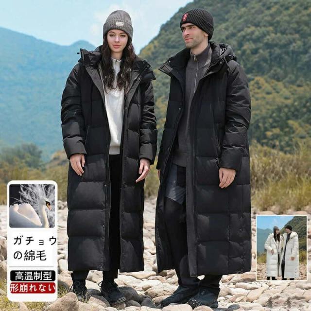 超ロング ダウンコート メンズ ベンチコート レディース ダウン 防寒着 ロングコート 膝下 冬 アウター 厚手 保温 ロング丈 アウトドア フード付き ハイネック お揃い スポーツ観戦 通勤 通学 あったか ホワイト ブラック