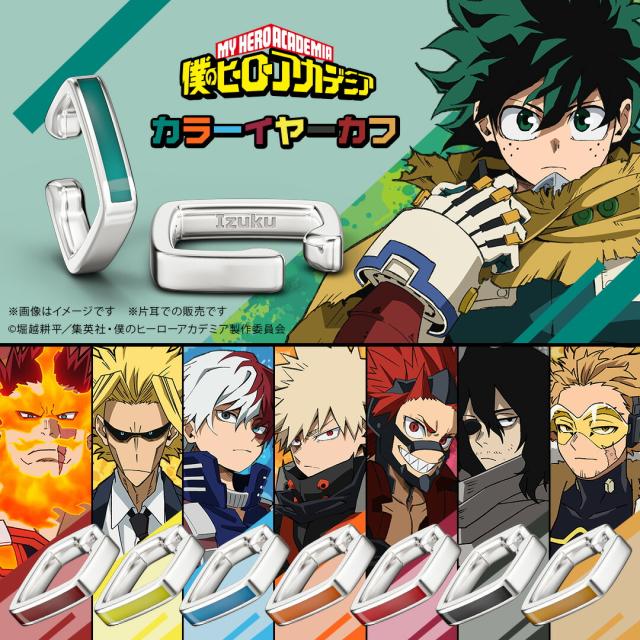 「緑谷出久」「爆豪勝己」「轟焦凍」「切島鋭児郎」「オールマイト」「相澤消太」「エンデヴァー」「ホークス」それぞれのイメージカラーを施したイヤーカフ。