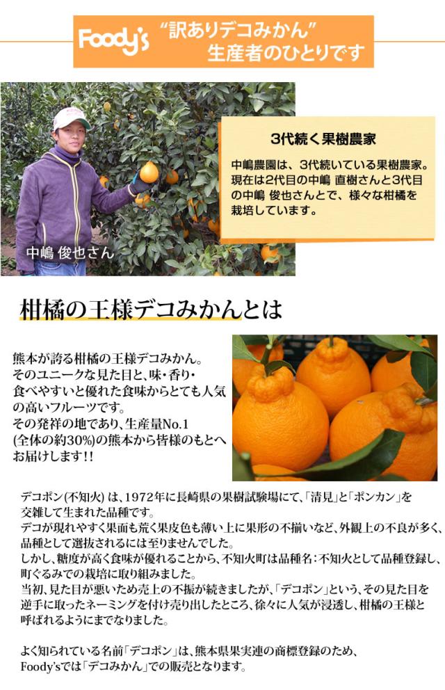 熊本が誇る柑橘の王様訳ありデコみかん(デコポン)。ユニークな見た目と、味・香り・食べやすいと優れた食味からとても人気の高いフルーツです。その発祥の地であり、生産量No.1(全体の30%)の熊本から皆様のもとへお届けします。
