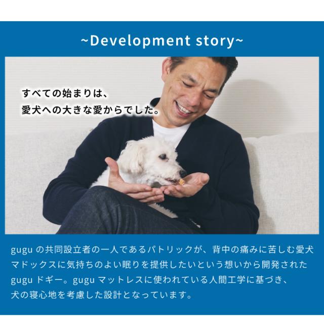 人間と同じフォームを贅沢に使用したguguドギーベッドは、10年以上の耐久性があり1度購入すれば再度買い替える必要はありません。自分の匂いがする場所にいるとリラックスできるワンちゃんにとって、ずっと変わらない「いつも安心できる場所」を。取り外し可能なカバーは洗濯も可能で、ずっと清潔に使用することができます。また、ライフサイクルの変化によりインテリアが変わっても自然と部屋に馴染むシンプルでミニマルなデザインに。大切な愛犬が子犬からシニアになっても、いつでも安心して快適にくつろげるように姿を見守れるようにと考えられたライフタイム・デザインのベッドを実現しました。