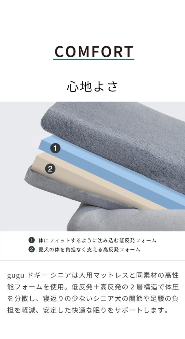 一般的な犬用マットレスと違って、gugu ドギー シニアは人用マットレスと同素材の高性能フォームを使用。低反発+高反発の2層構造で体圧を分散し、寝返りの少ないシニア犬の関節や足腰の負担を軽減、安定した快適な眠りをサポートします。