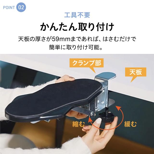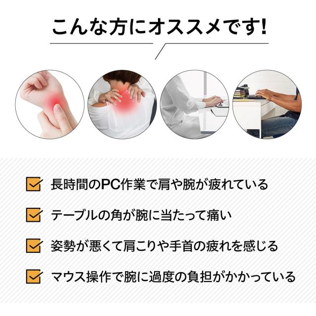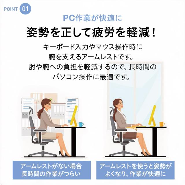 \肩・腕の負担をグッと軽減!デスク用アームレスト/ マウス操作やキーボード入力のときの「肩こり」「腕のだるさ」が気になる方にぴったり。 今お使いのデスクに取り付けるだけで、肘をしっかり支える快適アームレストです。