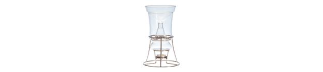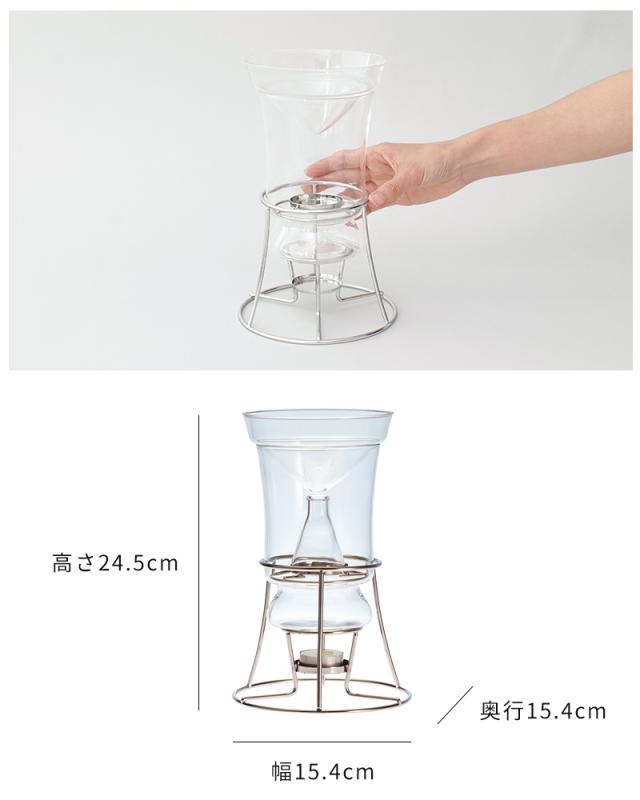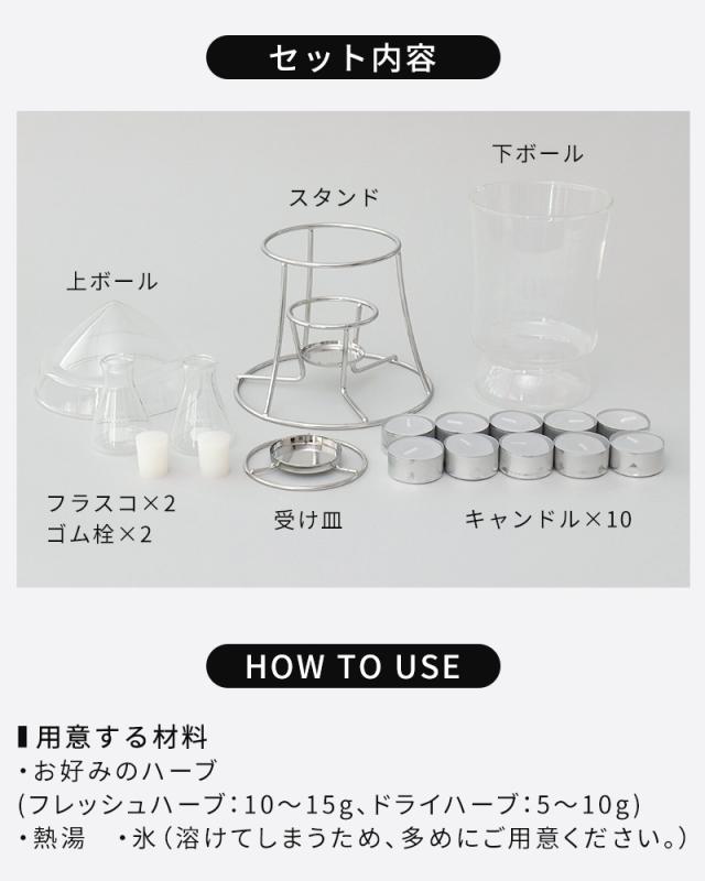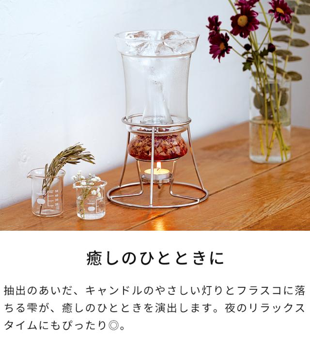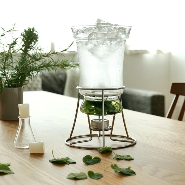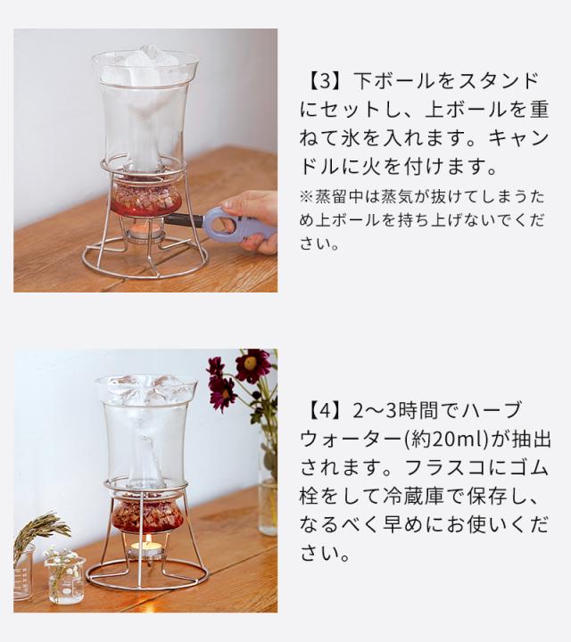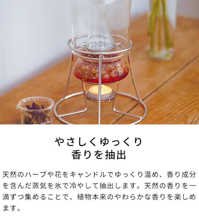 天然のハーブや花の香りをやさしく抽出できる芳香蒸留器「HARIO ハーブウォーターメーカー」。キャンドルの熱でゆっくりと蒸気を立ち上げ、氷で凝縮させることで、植物の香り成分を含んだハーブウォーターが一滴ずつフラスコに落ちていきます。できあがった蒸留水は、化粧水やリネンウォーター、ルームスプレーとして活用でき、暮らしに自然な香りをプラス。灯りを眺めながら楽しむ蒸留の時間は、心をときほぐす癒しのひとときえを演出します。