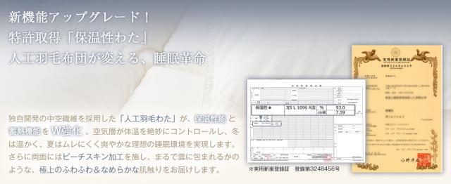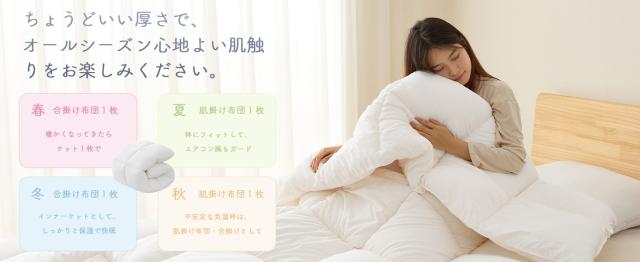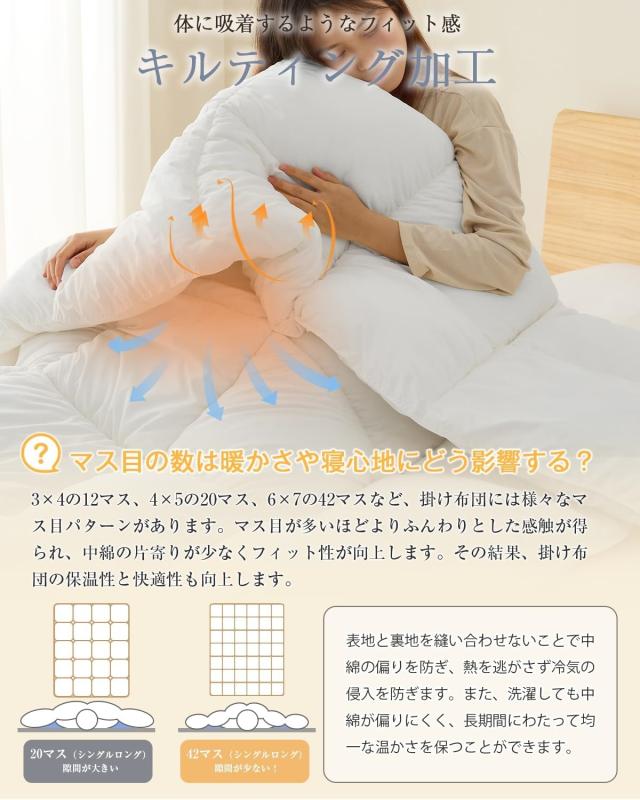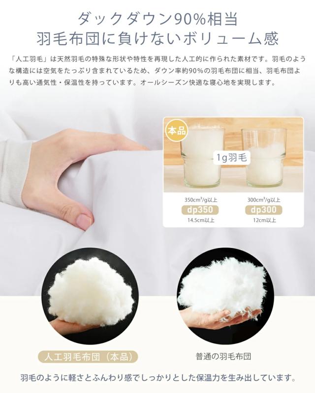 【ダックダウン90%相当・特許取得「人工羽毛」保温力UP】独自開発の中空繊維を採用した「人工羽毛わた」が、保温性能と蓄熱機能を強化しました。羽毛布団よりも高い通気性と保温性を両立しました。内部の空気層が体温を絶妙にコントロールし、理想的な睡眠環境を実現します。春秋はもちろん、夏の冷房対策にも最適な厚さで、季節を問わず一年中快適な寝心地です。