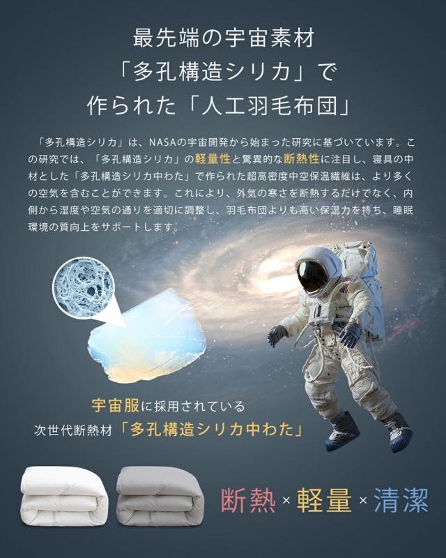 【宇宙服素材エアロゲル採用・軽量&高断熱】極小のナノファイバーが真空層を形成する「エアロゲル繊維」は、宇宙服にも採用されるほどの次世代断熱素材。驚くほどの軽さで高い断熱性を発揮し、外の冷気をシャットアウトしながらも、適度な通気性で湿気を逃がします。羽毛布団を上回る保温力で、良質な睡眠をサポートします。