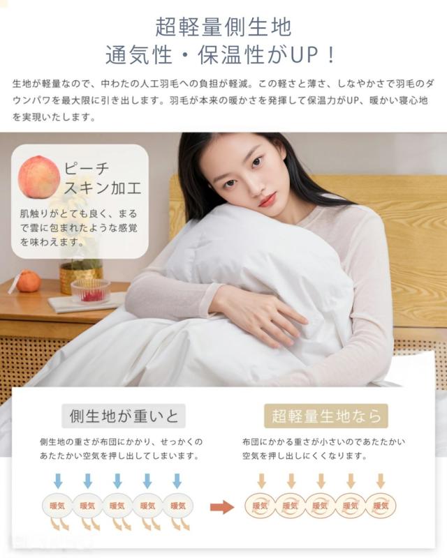 【帝人FWALINE+ピーチスキン加工・体にフィットする暖かさ】高品質の「帝人FWALINE」を中綿に採用し、肌に優しく沿い、ふんわりしなやかに身体を包み込みます。極細繊維の構造が繊維間に空気をしっかりと蓄えることで、暖かさを長時間持続させます。【両面ピーチスキン加工】ふわふわで柔らかな肌触りカバーなしで快適お使いいただけます。