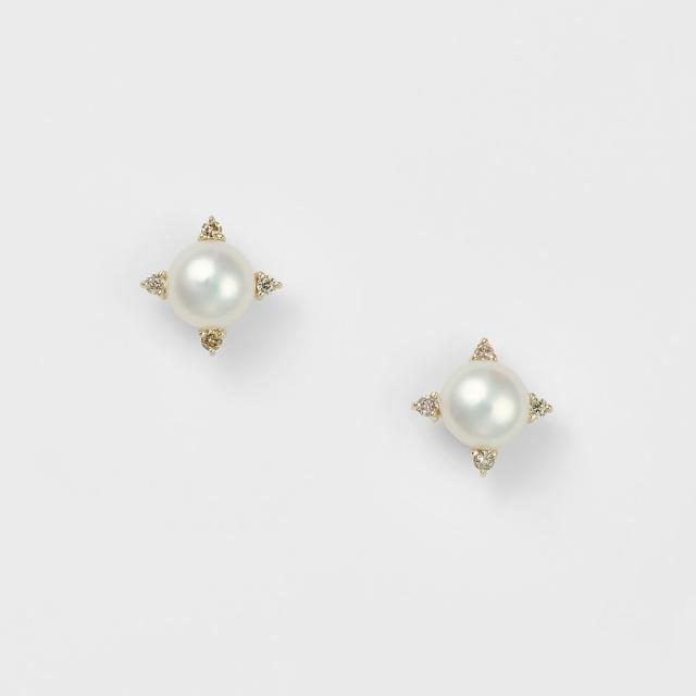 上品な輝きを放つ小さめのパールに、上下左右にあしらったダイヤモンドが華やかなアクセントを添えるスタッズピアス。程よいサイズ感で、オフィスからフォーマルシーンまで幅広く活躍します。シンプルながらも洗練されたデザインで、毎日のコーディネートに上質な輝きをプラスします。※天然石や天然素材を使用しているものは、サイズ・色味・風合いの違いや、若干の傷、内包物の有無などに個体差があります。予めご了承ください。※パールのサイズや形・風合いは1点1点異なります。※パールは、のり留め(芯立て)ですので水分にはご注意ください。