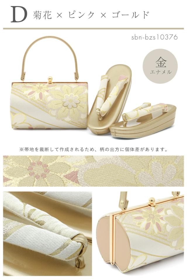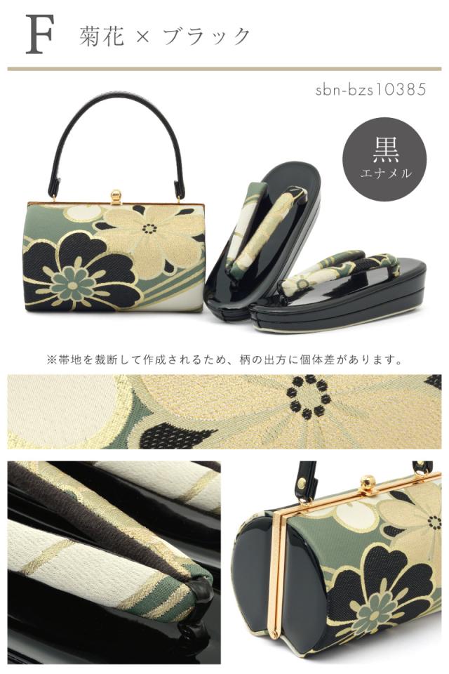 バッグと鼻緒は共布で、伝統的な花々をあしらった文様は上品で高級感のあるデザインです。