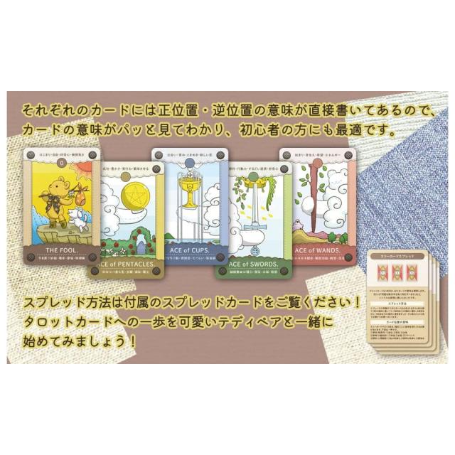 それぞれのカードには正位置・逆位置の意味が直接書いてあるので、カードの意味がパッと見てわかり、初心者の方にも最適です!スプレッド方法は付属のスプレッドカードをご覧ください。はじめてのタロット占いへの一歩を、可愛いテディベアと一緒に始めてみてはいかがでしょうか!