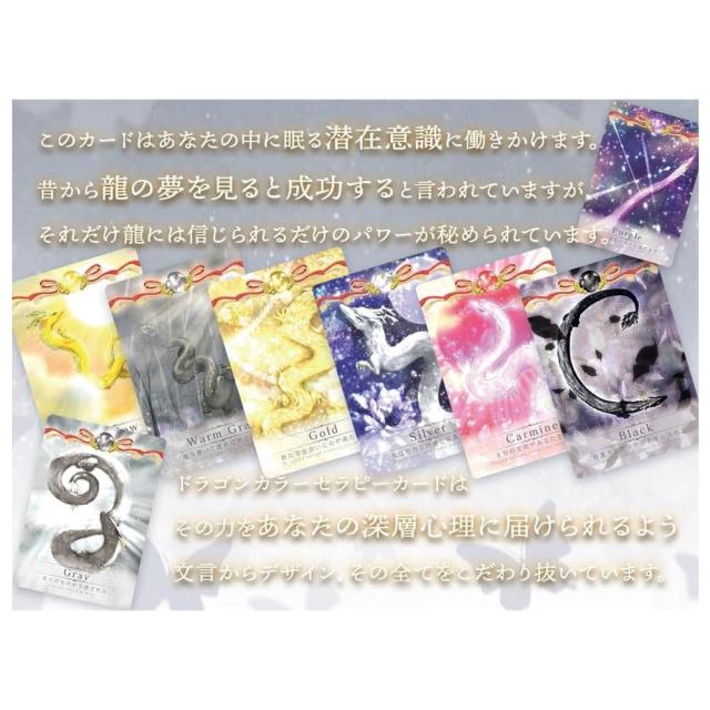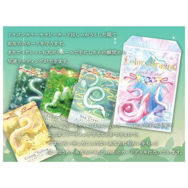 カラーセラピードラゴンオラクルカードは、龍神さまのご加護を受けた、カラーセラピーヒーリングにも用いられるオラクルカードカードです。龍神様の加護を受け、その時々の感情や思いを色付けてこのカードを引く事であなたの心が軽くなり、 一歩ずつ未来が明るくなるように作られています。このカードはあなたの中に眠る潜在意識に働きかけます。