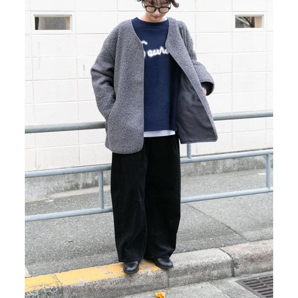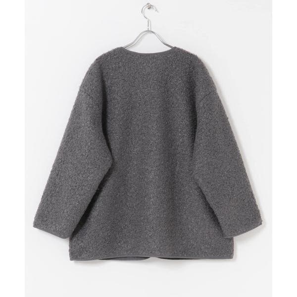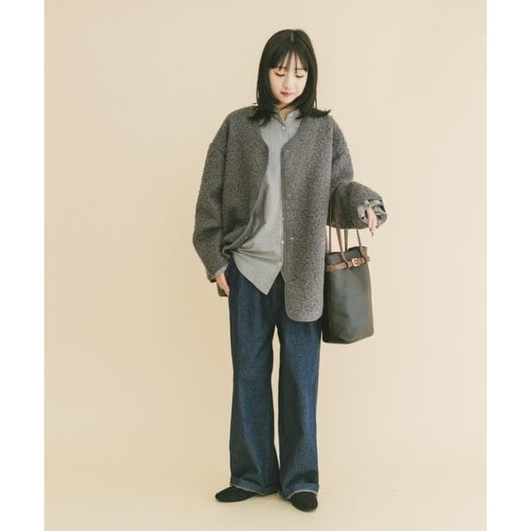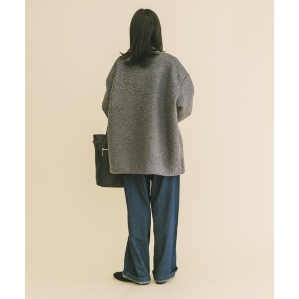 軽やかでふんわりとしたボア素材を使用したジャケットは、見た目にも暖かく、着心地も軽やか。丸みのあるリラックスシルエットが女性らしい柔らかな印象を与えます。首元はすっきりとしたノーカラーデザインで、インナーを選ばず着回し可能。ゆったりとしたオーバーサイズシルエットで、厚手ニットやスウェットの上からも快適に羽織れます。ミドル丈でボトムスとのバランスも取りやすく、カジュアルからきれいめまで幅広く活躍する一着です。
