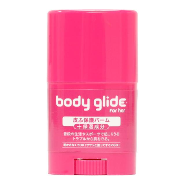 For HerTMは、内ももや脇の下、足のかかとやつま先などに塗布することで、肌を守ります。バームが目に見えないバリアを生成し、肌荒れを防ぎます。どのような環境下でも使用でき、仕事、旅行、フィットネスなど、毎日使用するのに理想的なアイテムです。さらっとした付け心地の透明なバームが目に見えないバリアを形成しなめらかな滑りを与えることで、ウォーキングやランニング、激しいスポーツなどで起こるトラブルから未然に肌を守ります。水や汗にも強く、汗を逃して肌を呼吸させることで毛穴を清潔に保ち、厳しい環境下での使用でも快適かつ効果的な付け心地を維持します。乾燥時間不要なのでアクティブな毎日を過ごす方の強い味方です。For HerTMは、Body Glideオリジナルの皮ふ保護バームに、ヤシ油とアーモンド油の成分を配合しています。ビタミンA、B、 E、Fを豊富に含むこのフォーミュラは、サラサラとしたテクスチャーです。汗を逃して肌を呼吸させることで毛穴を清潔に保ちます。敏感肌、乾燥肌にも使用でき、肌本来のうるおいを守ります。アレルギーテスト済みの植物由来成分で子供の肌にも優しく、石油系成分不使用、パラベンフリーの製品です。バームの成分がウェットスーツ、ウェア、フットウェアを傷めることもありません。