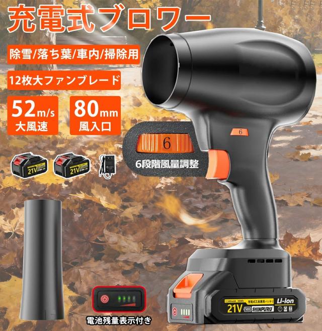 【2025モデル 】ブロワー 充電式 洗車 6段風速ロック ノズル付きブロワー エアダスター大容量pse認証済バッテリー 電量残量表示 強力 センシャ ブロアー 52m/s大風速 210000RPM 80mm風入口 12枚大ファンブレード ターボブロワー ターボファン 軽量コードレス 小型