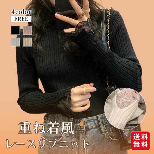 ニット 袖レース ハイネック トップス 長袖 レディース 重ね着風 フレア袖 レースニット カットソー リブニット フリルネック フィット ニットセーター 柔らかい 可愛い 着痩せ 体型カバー 秋冬 春 おしゃれ