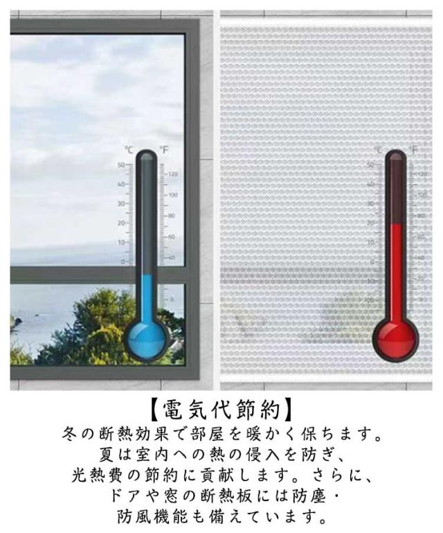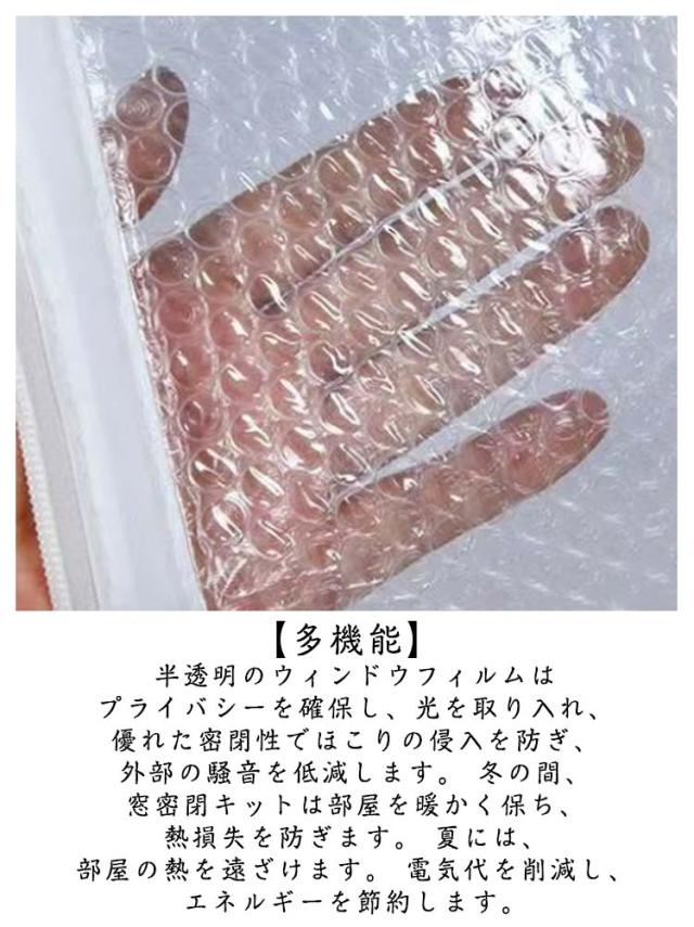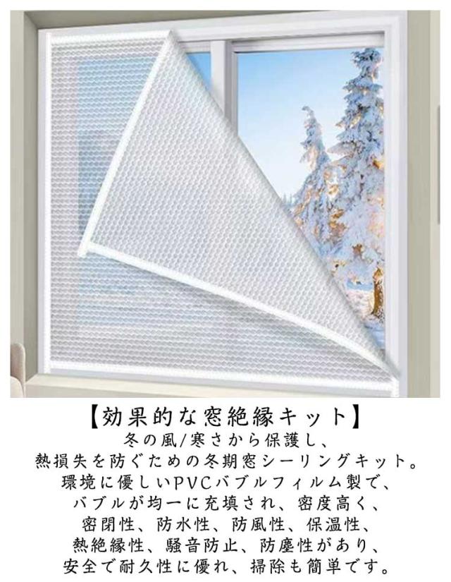 | 窓枠に貼るだけ!冷気を防ぐ断熱カーテンです。 【効果的な窓絶縁キット】冬の風/寒さから保護し、熱損失を防ぐための冬期窓シーリングキット。環境に優しいPVCバブルフィルム製で、バブルが均一に充填され、密度高く、密閉性、防水性、防風性、保温性、熱絶縁性、騒音防止、防塵性があり、安全で耐久性に優れ、掃除も簡単です。 【電気代節約】冬の断熱効果で部屋を暖かく保ちます。夏は室内への熱の侵入を防ぎ、光熱費の節約に貢献します。さらに、ドアや窓の断熱板には防塵・防風機能も備えています。 【多機能】半透明のウィンドウフィルムはプライバシーを確保し、光を取り入れ、優れた密閉性でほこりの侵入を防ぎ、外部の騒音を低減します。 冬の間、窓密閉キットは部屋を暖かく保ち、熱損失を防ぎます。 夏には、部屋の熱を遠ざけます。 電気代を削減し、エネルギーを節約します。 | |