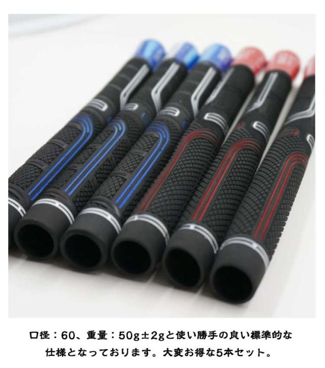 | ゴルフグリップ 5本セット。 握りやすく、手に吸い付く感触のあるラバーグリップを採用しております。 口径:60、重量:50g±2gと使い勝手の良い標準的な仕様となっております。 大変お得な5本セット。 | |