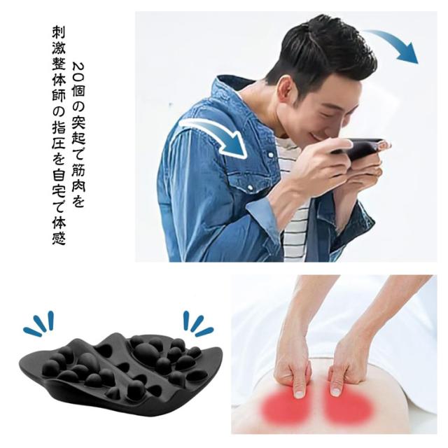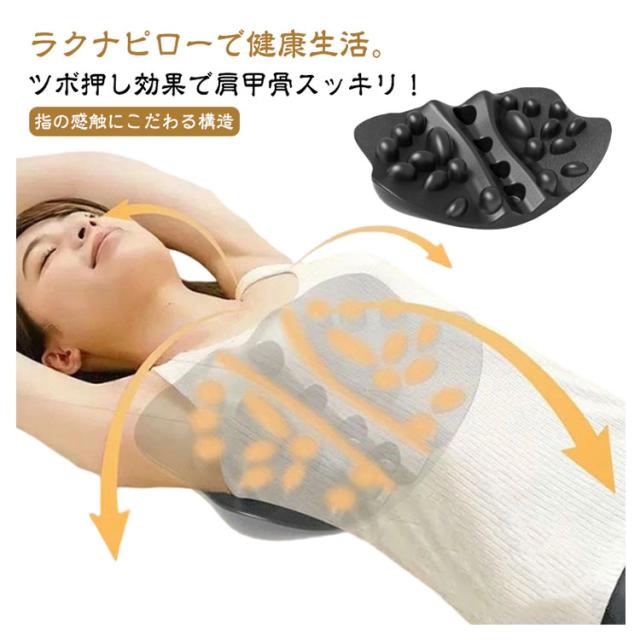 | ツボ押し効果で肩甲骨スッキリ!ラクナピローで健康生活。 指の感触にこだわる構造 自宅で極上の幸せなストレッチを体感する ポイント1 20個の突起で筋肉を刺激整体師の指圧を自宅で体感 ポイント2 前後+突起の立体刺激設計 正面:広範囲で背中をしっかりサポート 背面:フィット感抜群で心地よく伸ばす 突起部:指圧のようにピンポイントで刺激 人間工学に基づいた凹凸 コリを伸ばす姿勢がよくなる 湾曲カーブが肩甲骨を伸ばす ポイント3 “ゆらゆら”構造 慣れてきたら図のように左右に揺れて体重をかけると、より効果を実感できます。 ※無理せずゆっくりと行ってください。 ポイント4 肩甲骨だけではなく背中、腰、お尻、骨盤にも使える オフィスチェアや車のシート、ソファ、 ダイニングチェアにも使用できる 簡単なストレッチ&リラックス 肩甲骨周りの凝り固まった筋肉を 10分間横になってほぐす! | |