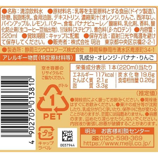 【フルーツ】乳等を主要原料とする食品(ドイツ製造)、砂糖、脱脂粉乳、食用油脂、デキストリン、濃縮果汁(オレンジ、りんご、西洋なし、パインアップル、レモン)、バター、食塩、バナナピューレ/酸味料、乳化剤、香料、酸化防止剤(生コーヒー豆抽出物)、甘味料(ステビア)、着色料(β-カロテン)
