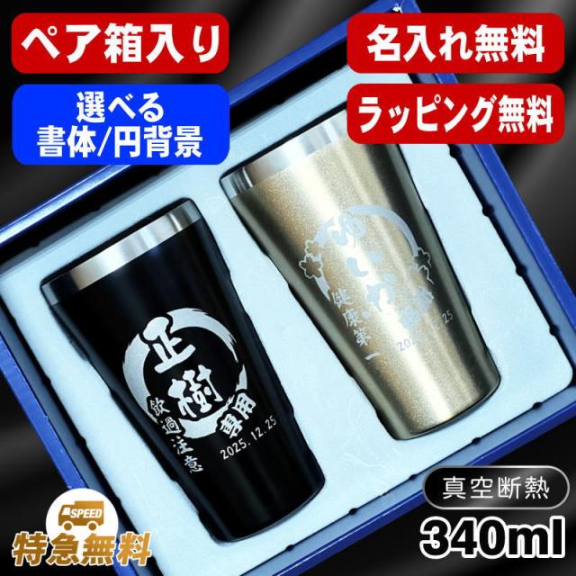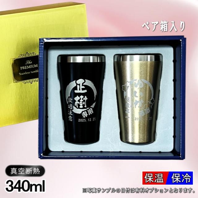 【ペア箱入り】 名入れ タンブラー ペア 名前入り プレゼント 真空断熱 保温 保冷 ステンレス 彫刻 刻印 グラス コップ おしゃれ ビールグラス 父の日 母の日 還暦祝い 結婚祝い 実用的 ネーム入れ 男性 女性 バースデー ギフト 送料無料 340 ml 金 黒 セット 円背景 EH13