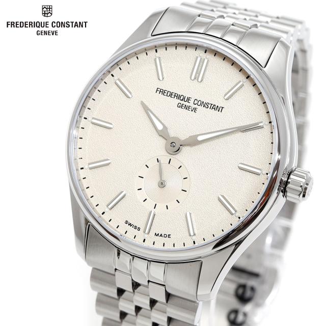 小ぶりな39mmケースに、5連の半円形リンクが連なるブレスレットを採用。文字盤には、6時位置にスモールセコンド。アルファ針とアプライドバーインデックス+ドットには蓄光仕上げを採用。アイボリーカラーに光沢を抑えたマットフィニッシュ仕上げを配し、スモールセコンド文字盤にはスネイル仕上げと細部にまでこだわっています。視認性の高いシンプルなデザインで日常使いにふさわしい時計です。【フレデリック・コンスタント FREDERIQUE CONSTANT 2025 新作】