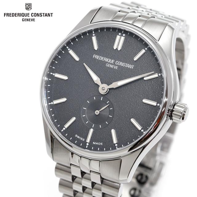 小ぶりな39mmケースに、5連の半円形リンクが連なるブレスレットを採用。文字盤には、6時位置にスモールセコンド。アルファ針とアプライドバーインデックス+ドットには蓄光仕上げを採用。ダークグレイカラーに光沢を抑えたマットフィニッシュ仕上げを配し、スモールセコンド文字盤にはスネイル仕上げと細部にまでこだわっています。視認性の高いシンプルなデザインで日常使いにふさわしい時計です。【フレデリック・コンスタント FREDERIQUE CONSTANT 2025 新作】