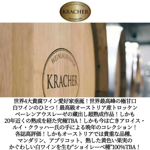 世界4大貴腐ワイン愛好家垂涎!世界最高峰の極甘口白ワインのひとつ!最高級オーストリア産トロッケンベーレンアウスレーゼの蔵出し超熟成作品!しかも20年近くの熟成を経た究極TBA!しかも今は亡きアロイス・ルイ・クラッハー氏の手による晩年のコレクション!各誌高評価!しかもオーストリアでは貴重な品種、マンダリン、アプリコット、熟した黄色い果実のかぐわしい白ワインを生む“ショイレーベ種”100%TBA!