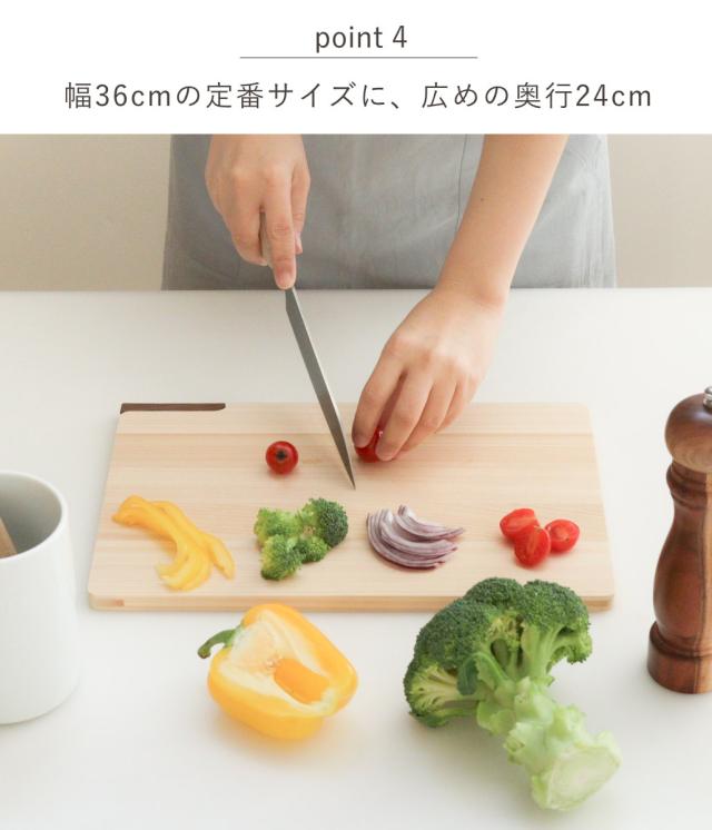 家庭で扱いやすいスタンダードサイズの幅36cmに、ゆとりを持って調理できる奥行24cmです。奥行に余裕があるため、切った食材を手前や奥に寄せながら作業しやすく、ひとつのまな板上で複数の工程を同時に進められます。作業効率もアップします。