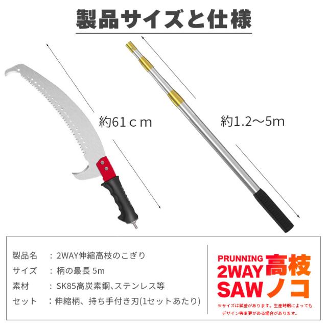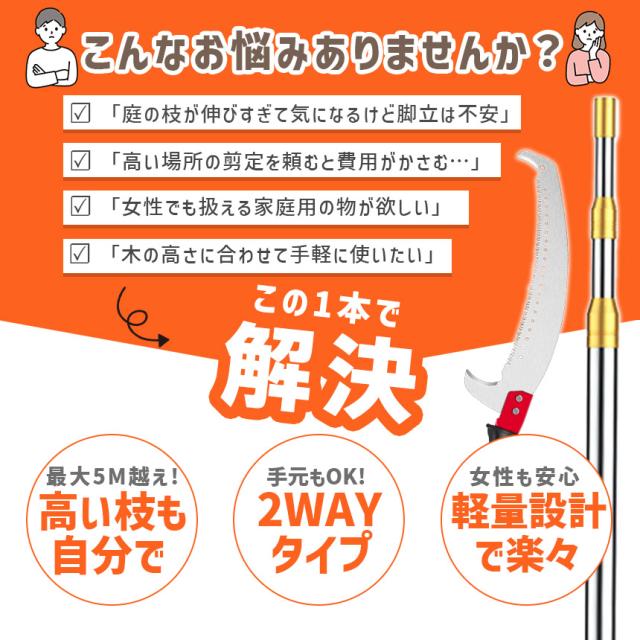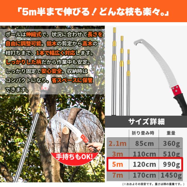 高枝ノコギリ 伸縮式 高枝切りノコ 切断のこぎり 高枝切りバサミ 高枝鋸 5m 伸縮ポール 枝切り 剪定 園芸用品 庭木 果樹 剪定のこぎり 高所作業 枝打ち 伐採 軽量 庭 手動剪定 ガーデニング用品