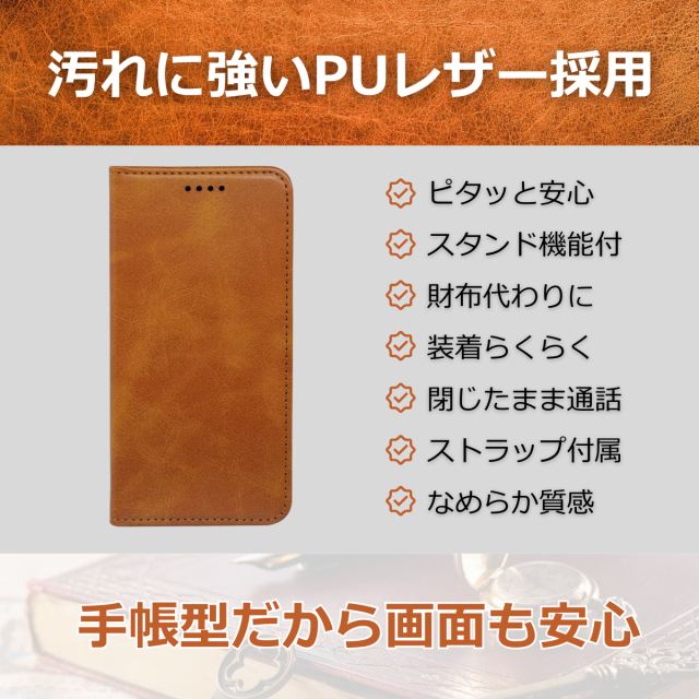 外側は高級感のあるPUレザー、内側は衝撃をやわらげるTPU素材を採用し、大切な端末をしっかり保護します。
