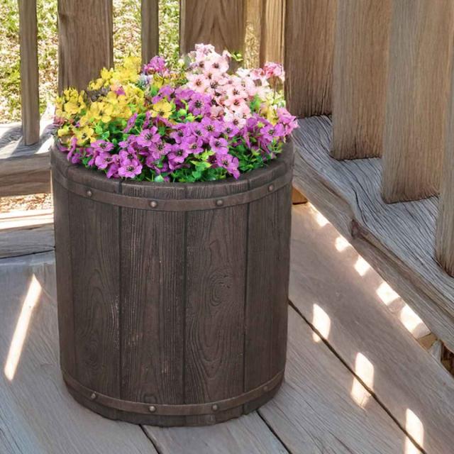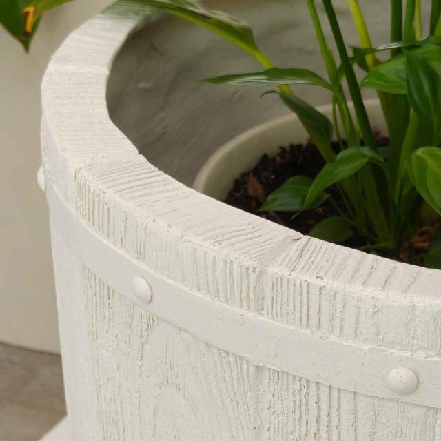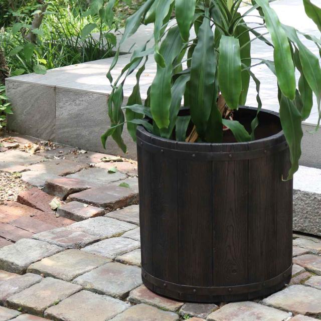 リアルな木調と、しっかりとした重厚感が魅力の丸型のプランターです。天然木のようなナチュラルな風合いはナチュラルにもモダンにも調和し、おしゃれなアクセントを添えます。