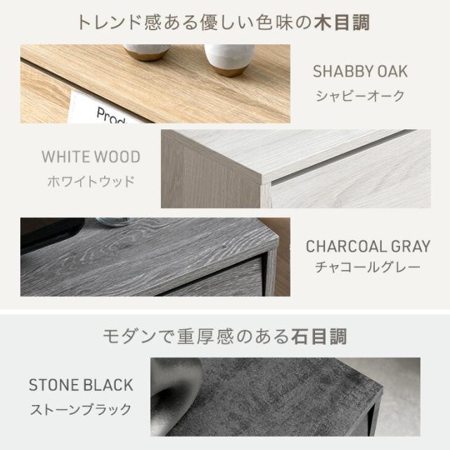 シャビーオーク、ホワイトウッド、チャコールグレー、ストーンブラック