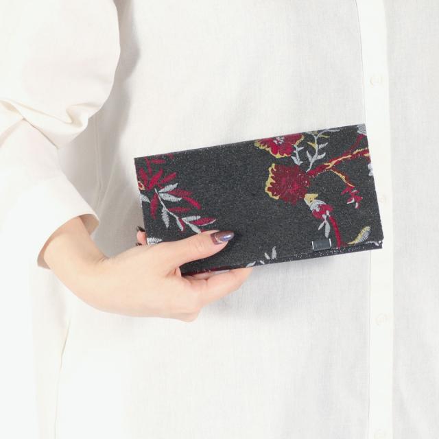 黒地に花の刺繍をあしらったかのような絵柄が印象的な長財布。和の趣と華やかなコントラストが美しく、近くで見ると糸のように細やかなラインが重なり、ブランドらしい美意識が際立ちます。上質な牛革を一枚で折り上げた軽量スリム仕様で、使うほどに味わいが深まり、日々の装いに上品なアクセントを添えてくれます。