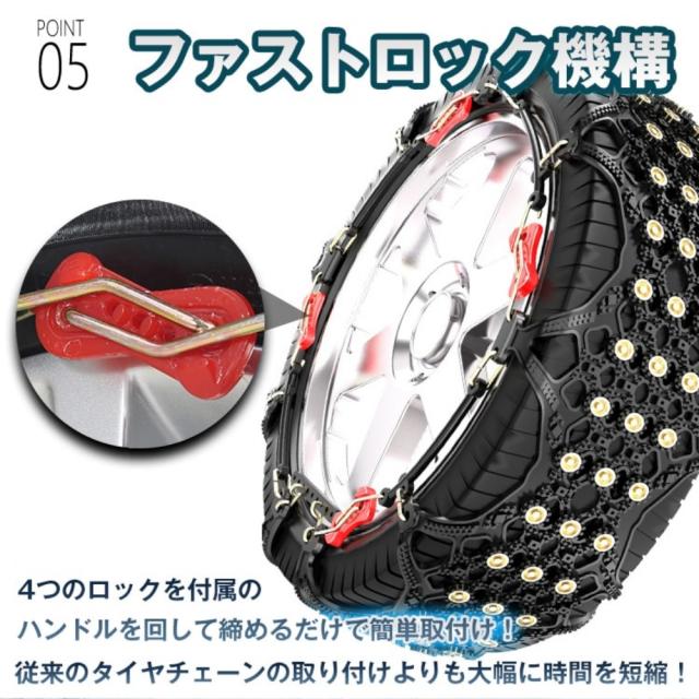 ■従来のタイヤチェーンの取り付けよりも大幅に時間を短縮できるファストロック機構です