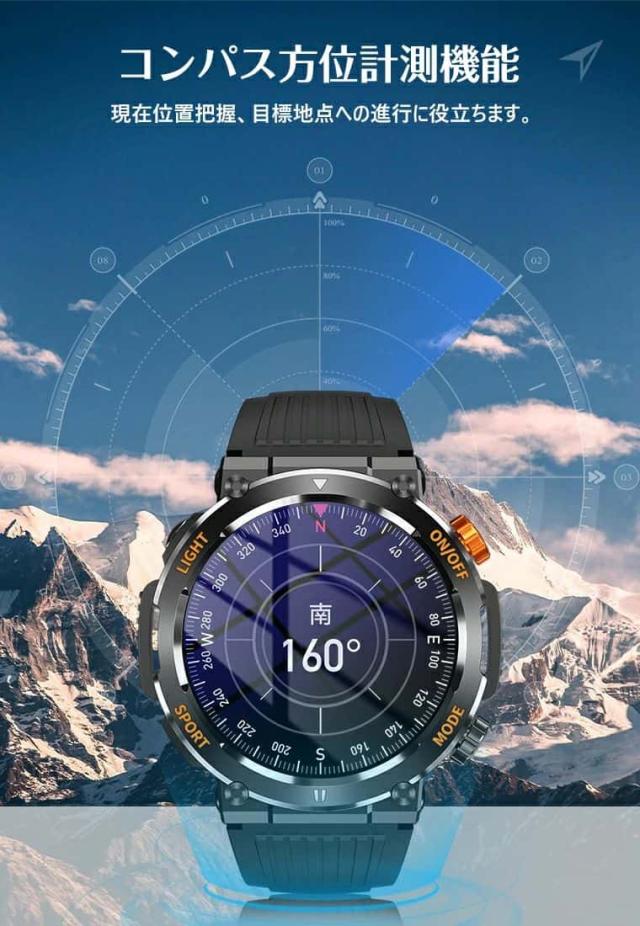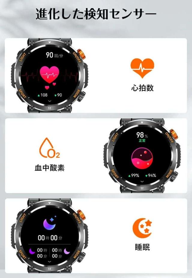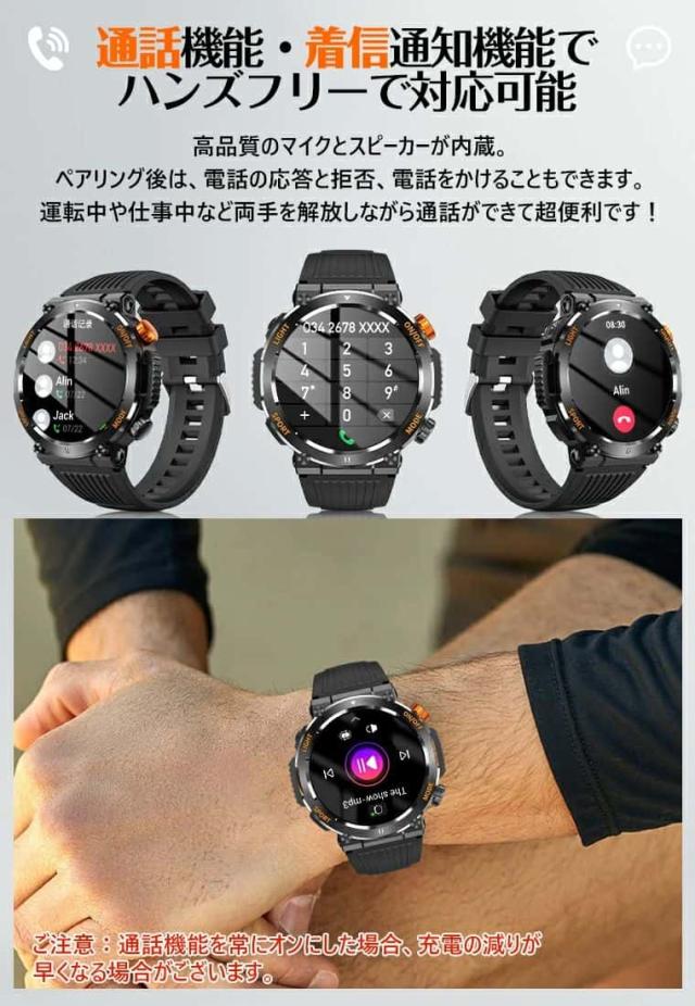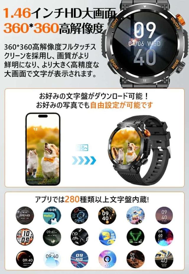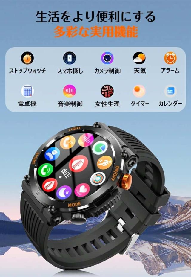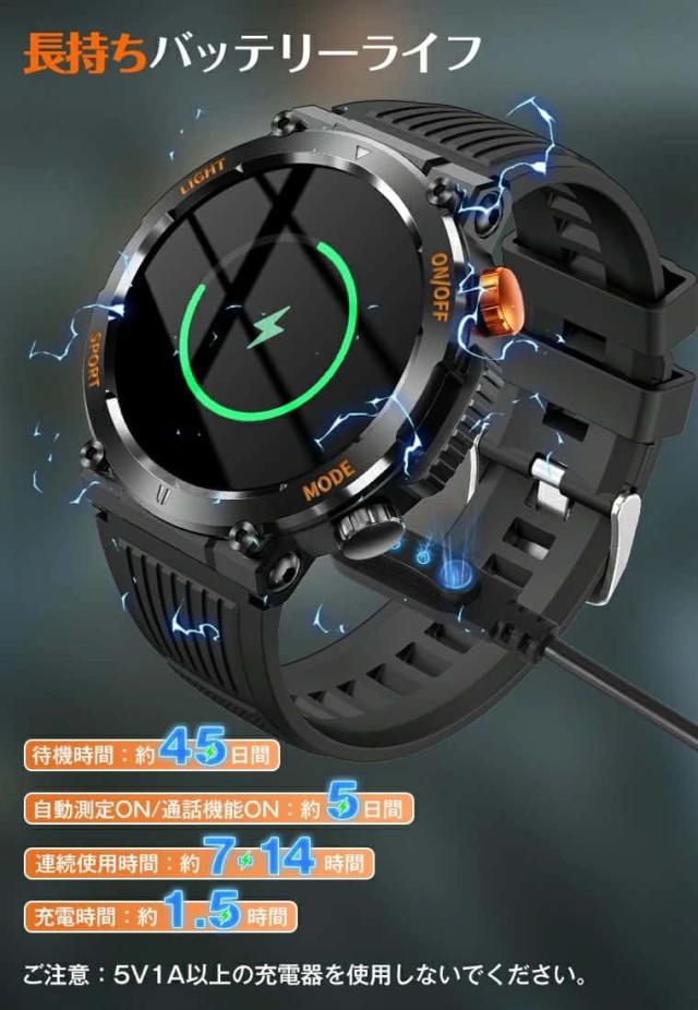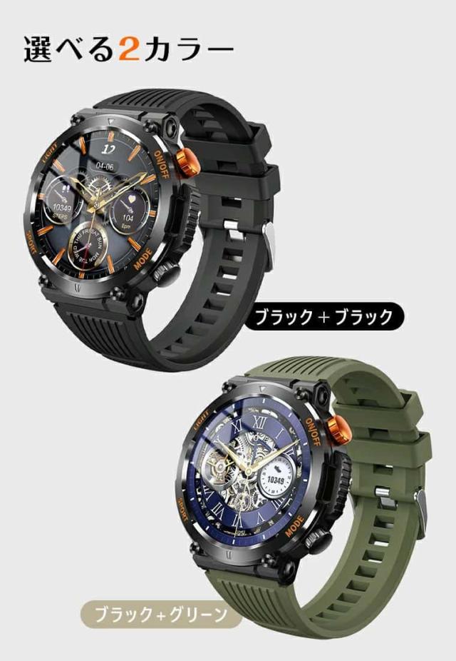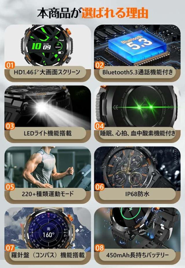 スマートウォッチ メンズ腕時計 アウトドア 24時間健康管理 血中酸素 軍用規格 C68スマートブレスレット 歩数計 心拍数 1.46インチ画面 ライト付き 着信通知 IP67防水 睡眠モード 運動モード 日本語説明書