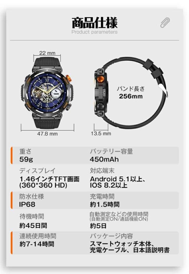 ・スマートウォッチ(本体)x 1 ・専用充電ケーブルx 1 ・日本語取扱説明書x 1 |