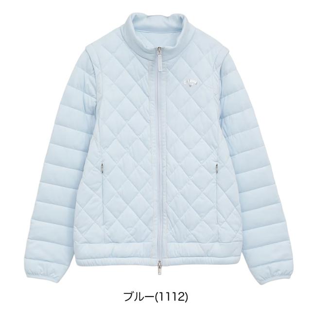 高機能素材「スターストレッチeco」を使用した中綿アウターです。嵩高性の高い中綿を採用しており、保温力に優れ、寒い冬でも快適に活躍します。袖は取り外し可能なデタッチャブル仕様で、寒暖差にも柔軟に対応可能です。フロントのラメパイピングとスライダーのリボンテープ、胸元のシルバープリントロゴが統一感のあるデザインポイントとなっています。品番:C25215202