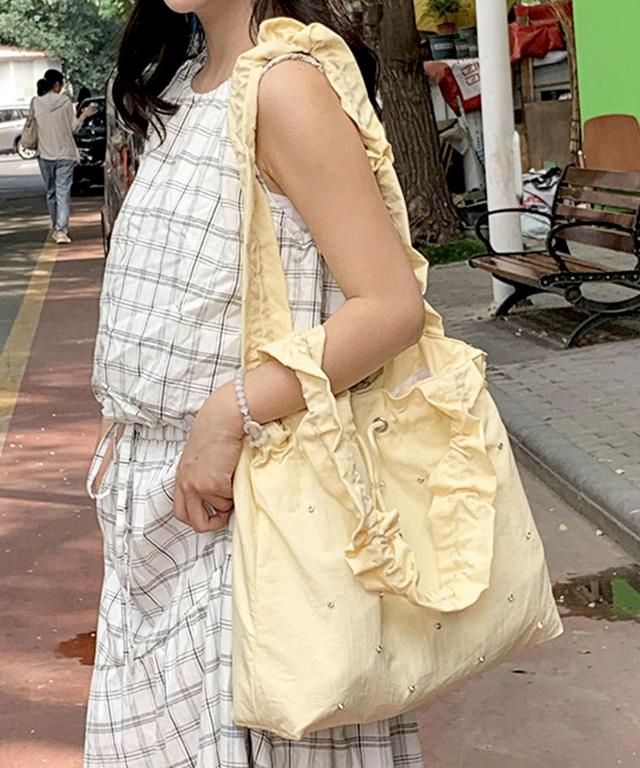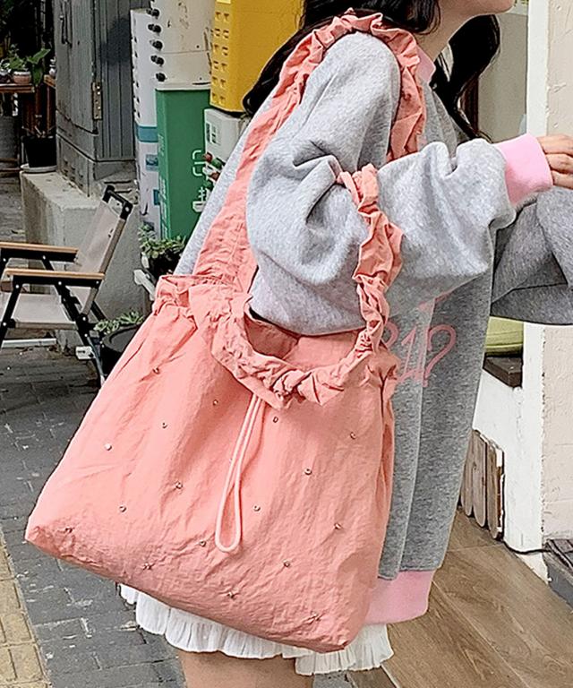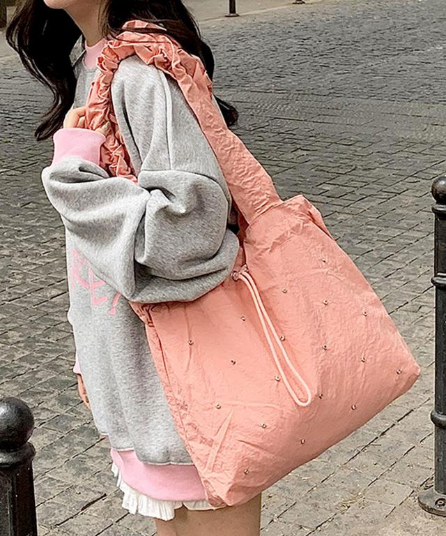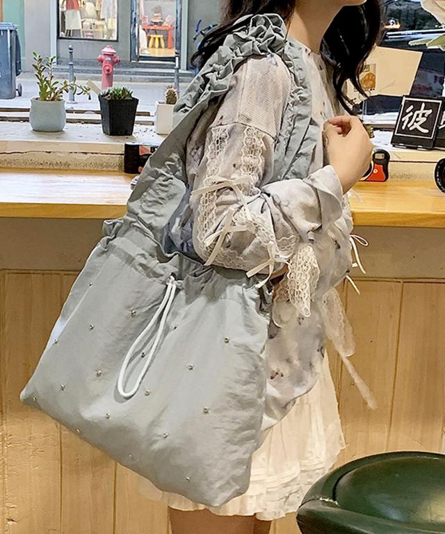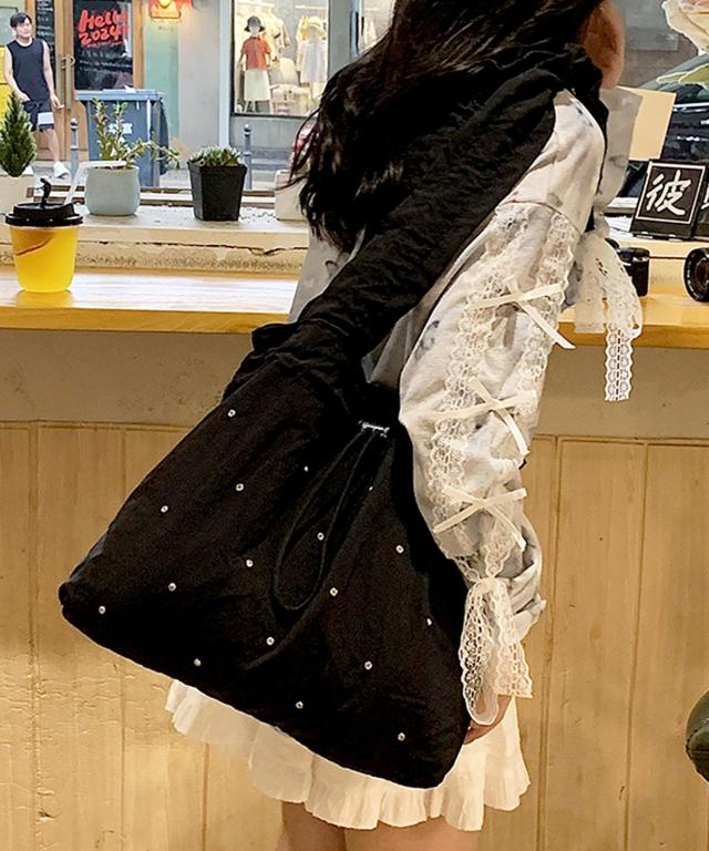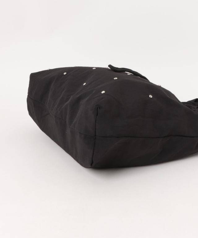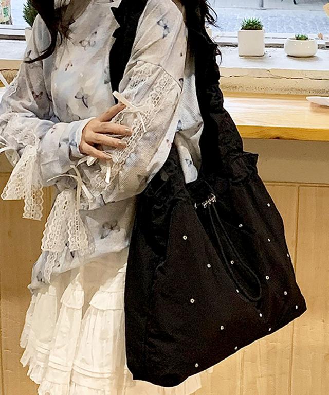 煌めきをプラスするラインストーンを散りばめ、ドロストフォルムがおしゃれなトートバッグ♪