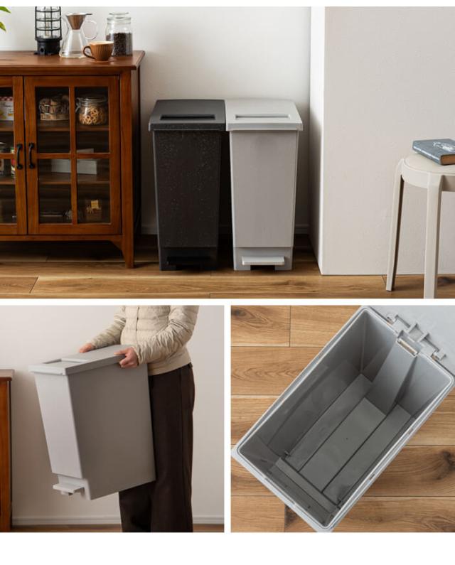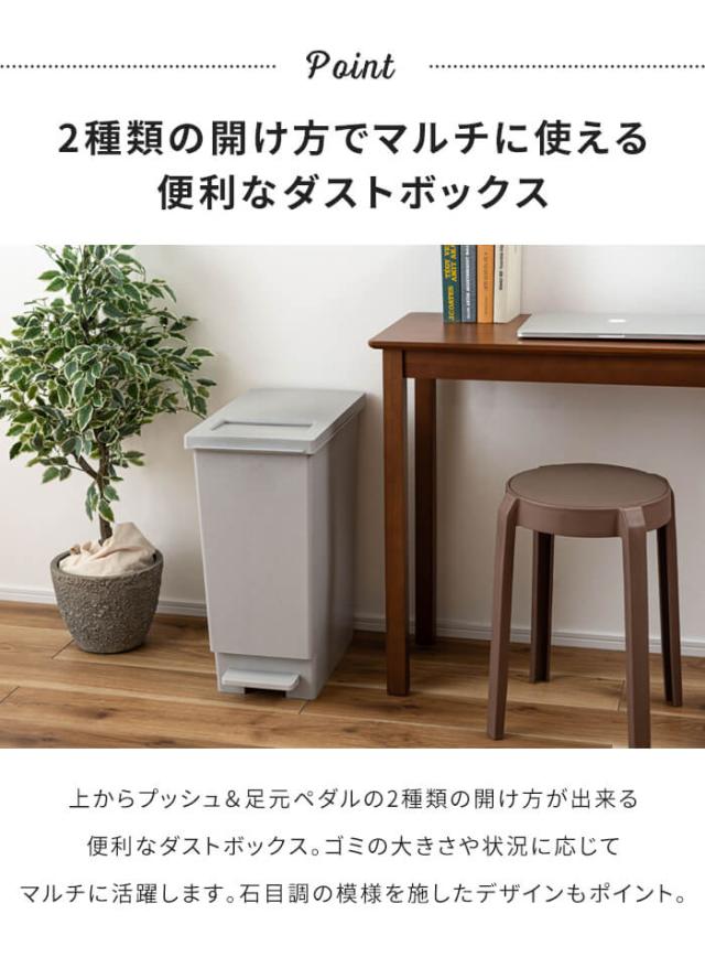| プッシュオープンと足元のペダルオープンの2種類の開け方ができる便利なダストボックス。 上部のプッシュフタは小さいゴミをサッと捨てる時に便利。 足元のペダルを踏めばフタが大きく開閉し、手を使わずにゴミが捨てられて、ごみの大きさや状況に応じて使い分けられます。 本体にはゴミ袋を固定できる袋止め付きでゴミ袋がズレ落ちる事もなくストレスフリー。 石目調の模様を施したおしゃれなデザイン。 |