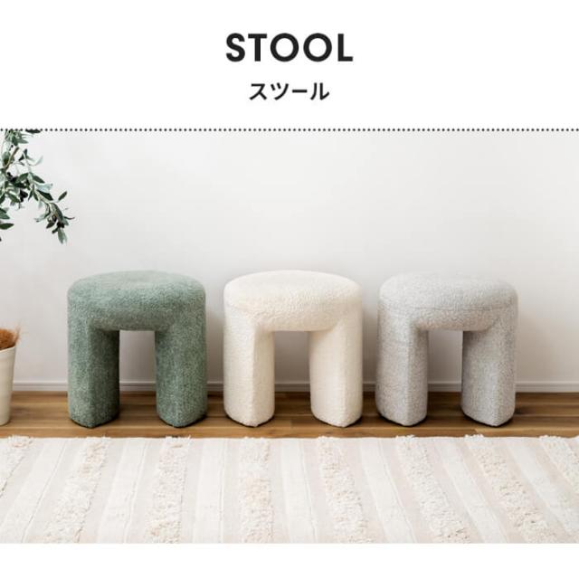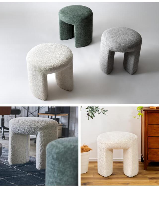 ◇角の丸いフォルムが魅力的で、心地良い肌触りのブークレ生地を使用したスツール。