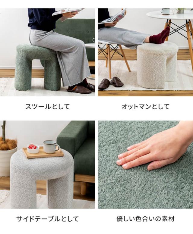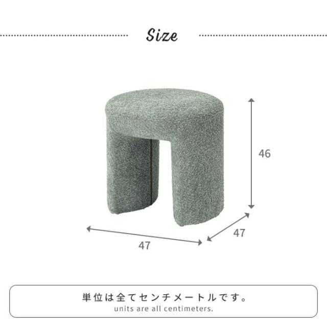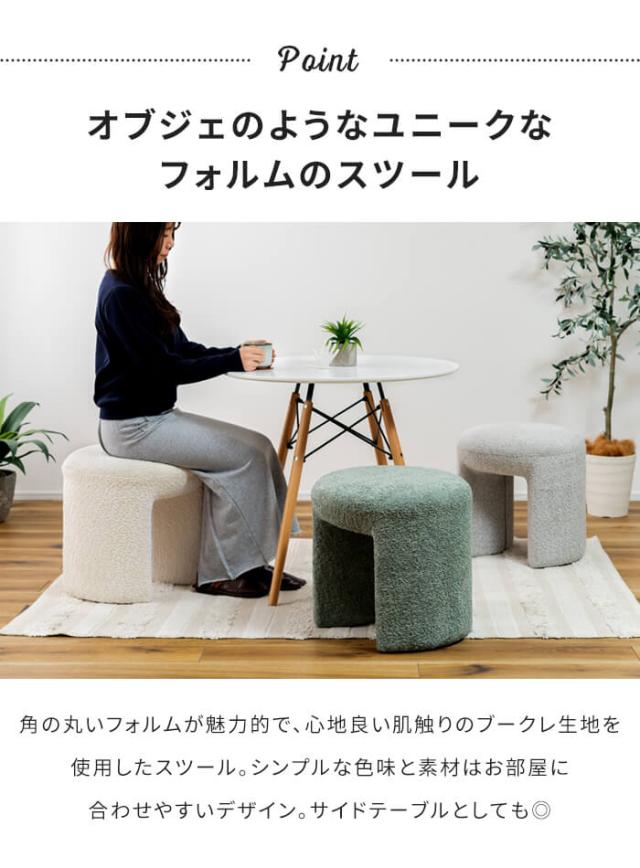 キーワード: スツール 丸椅子 ラウンド チェア イス 腰掛 円形 ブークレ生地 背もたれなし アームレス シンプル 無地 おしゃれ オットマン 1人掛け 簡易椅子 来客 サイドテーブル グリーン リビング 玄関 いす 北欧