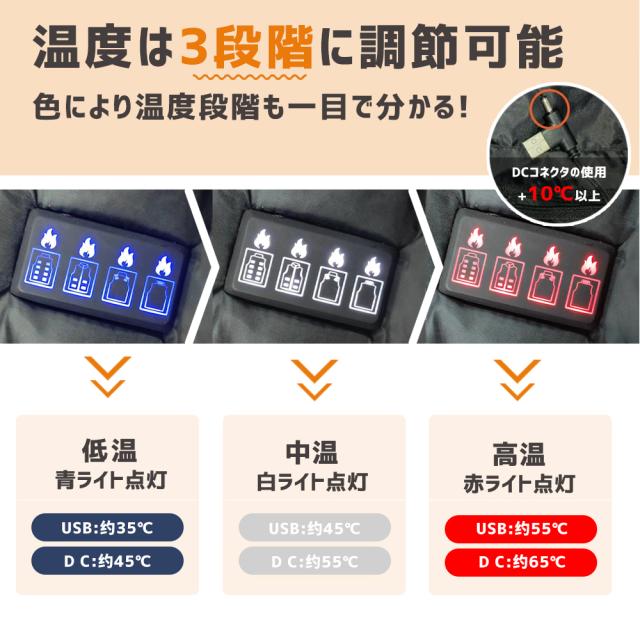 ※電熱ベストには恒温保護作用があります。プラグを挿してから3-5分后、自働的に高温から低温に切