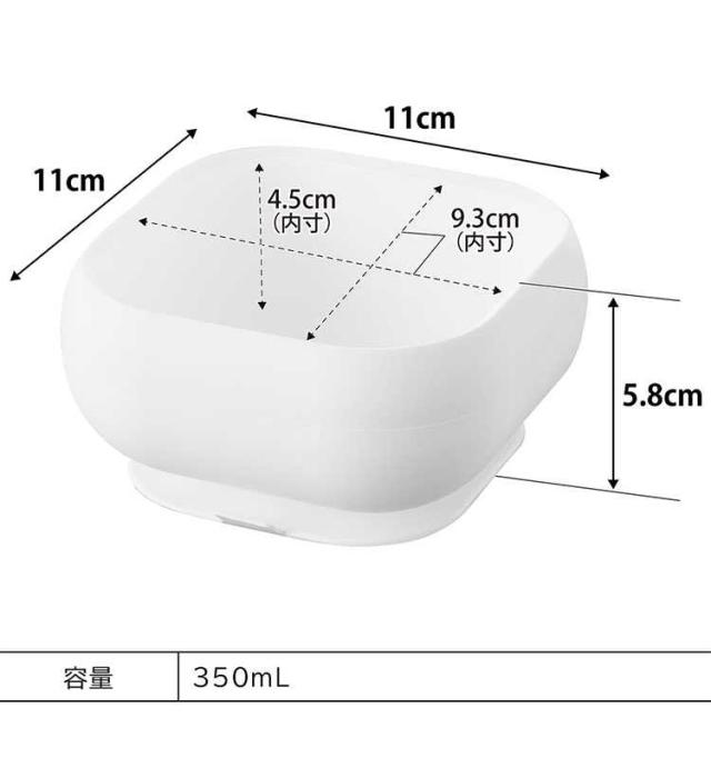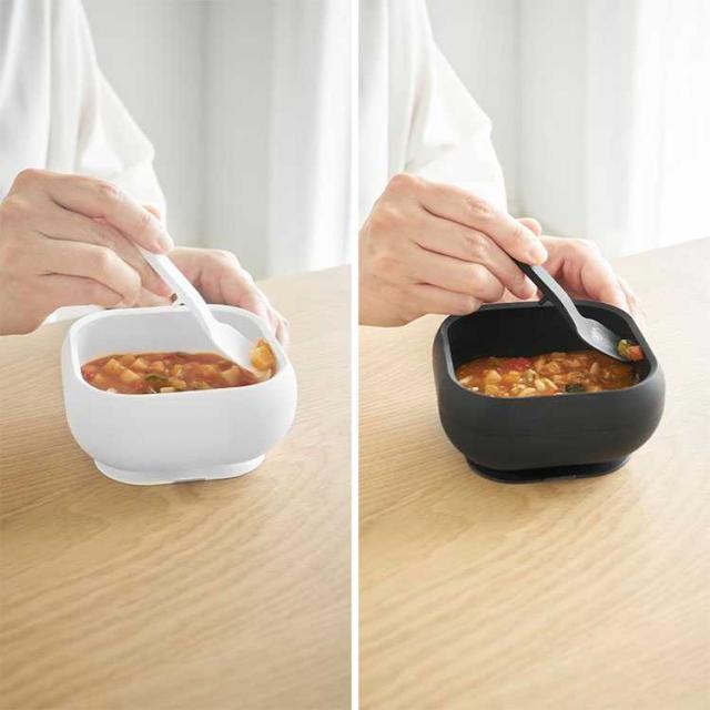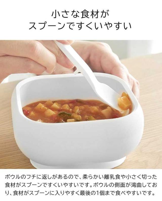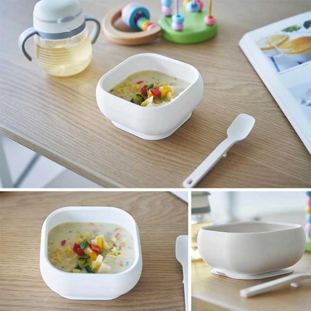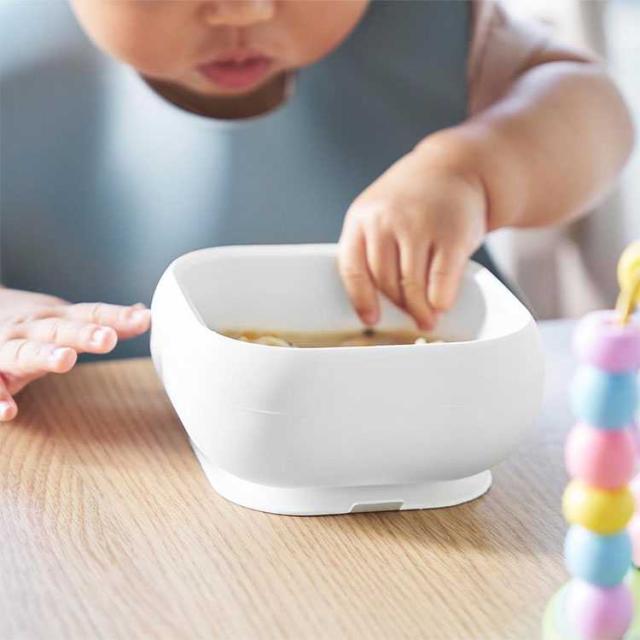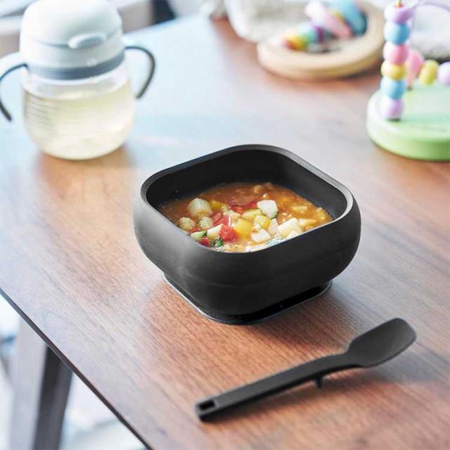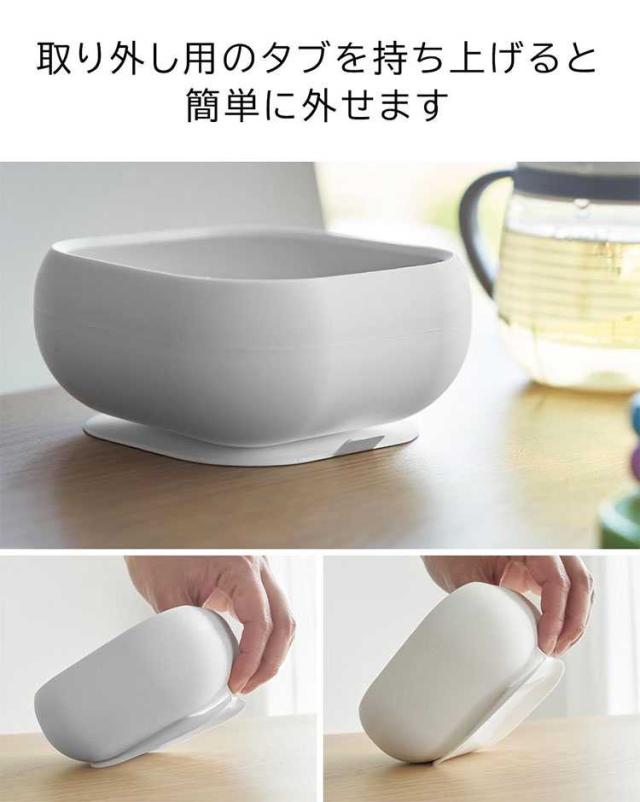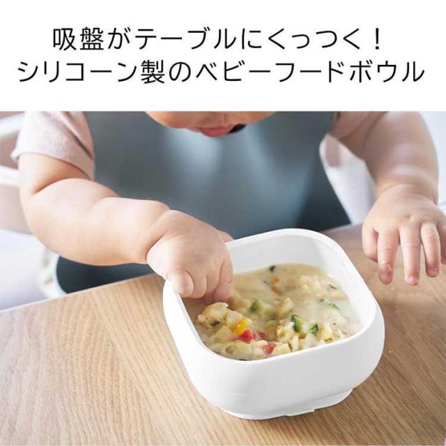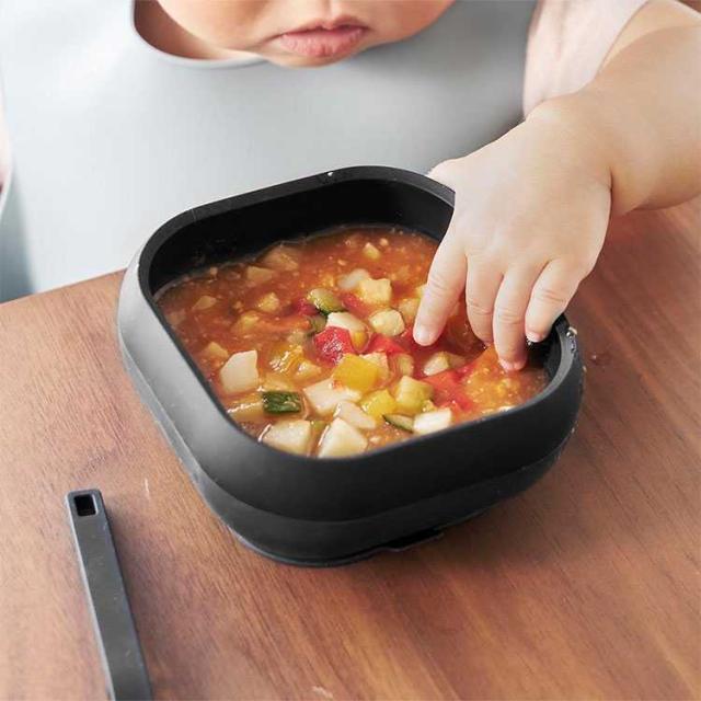 吸盤付きでボウルのフチに返しがあるのでスプーンですくいやすく、こぼれにくいシリコーン製のベビーフードボウルです。シリコーン製でしっかり吸着するので、手づかみ食べの時期のお子様にもおすすめです。取り外し用タブを持ち上げると吸盤が外れます。食洗機OK。電子レンジOK。冷凍庫OK。