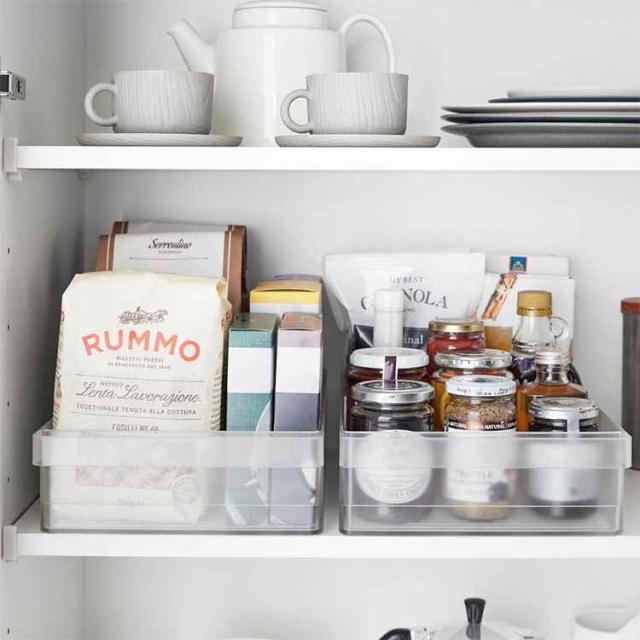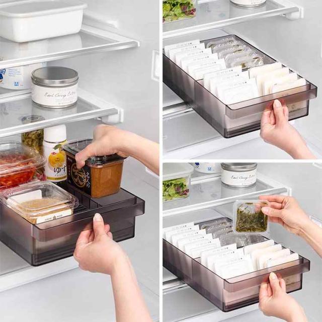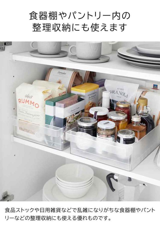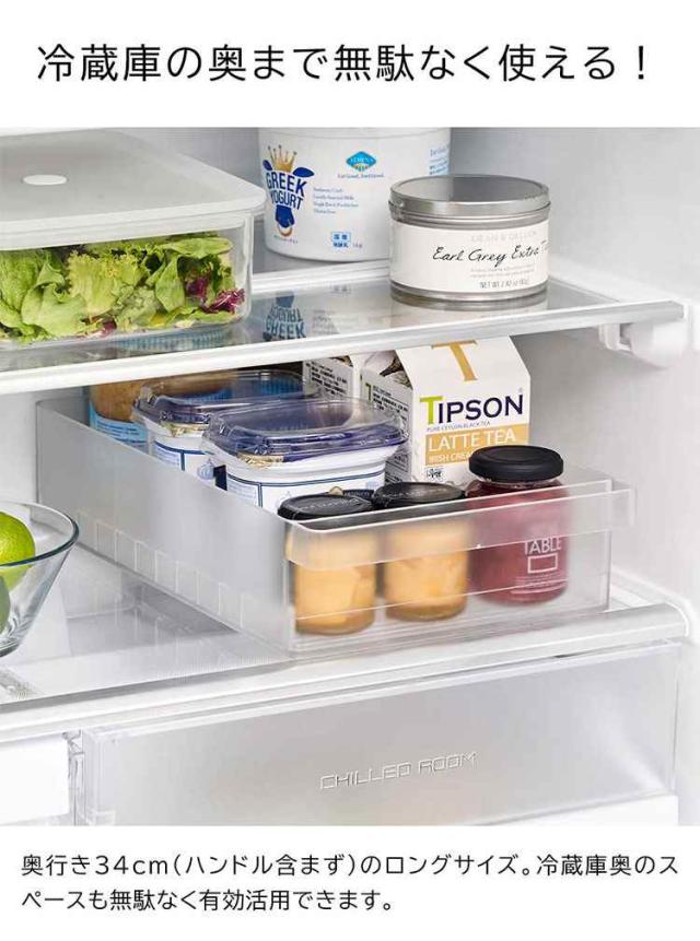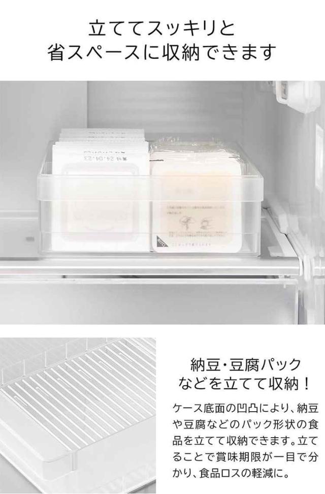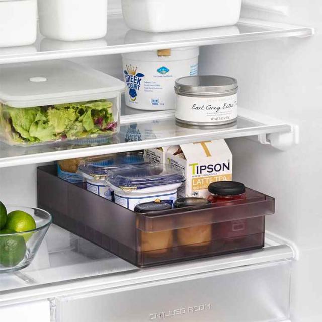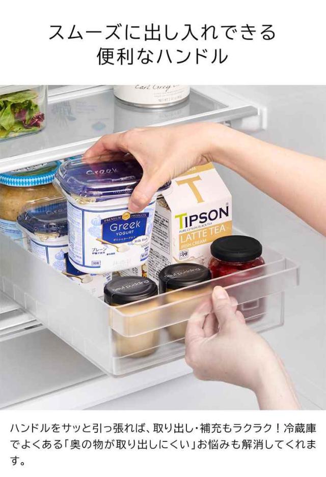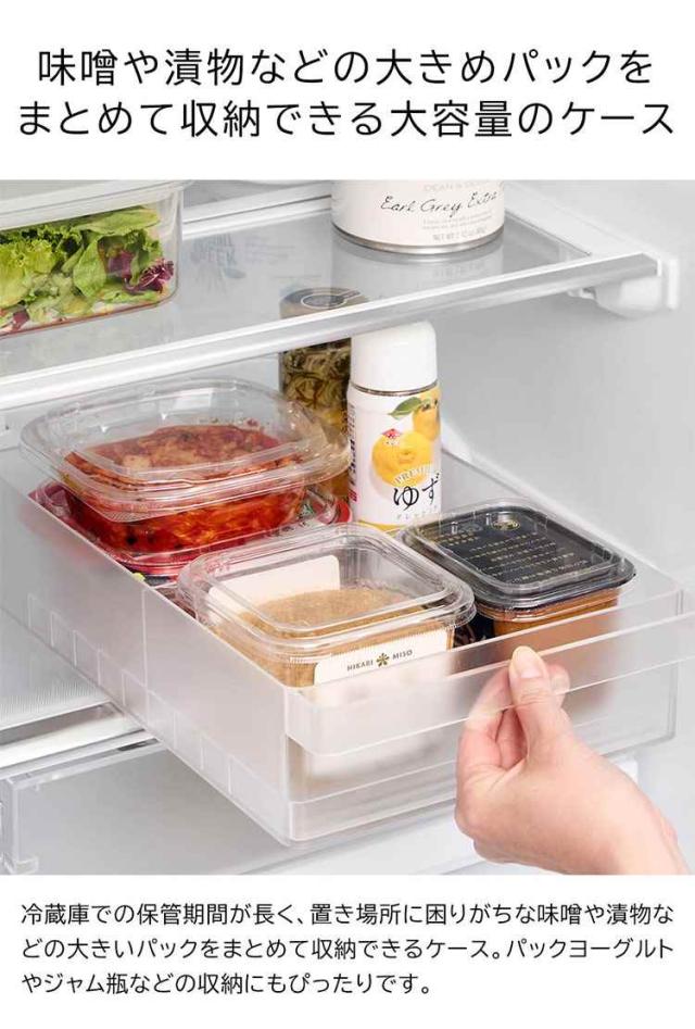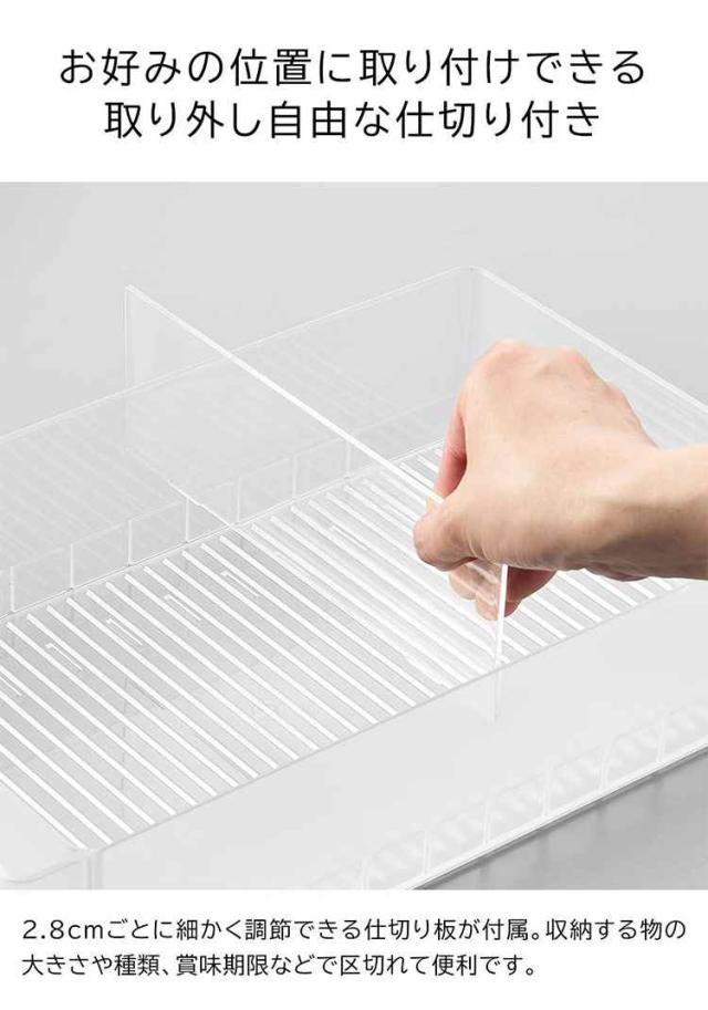 冷蔵庫中収納シリーズを並べて冷蔵庫の中をスッキリ整頓!冷蔵庫の奥まで無駄なく使えるワイドな仕切り付き収納ケース。味噌や漬物など大きめのパックをまとめて収納。ハンドルが付いているので、ラクに引き出せて奥の物も取り出しやすい設計。複数揃えて使用すれば、さらに冷蔵庫内がすっきりします。食器棚やストックルームでの整理整頓にもおすすめ。お好みの位置に変更できる便利な仕切り付き。