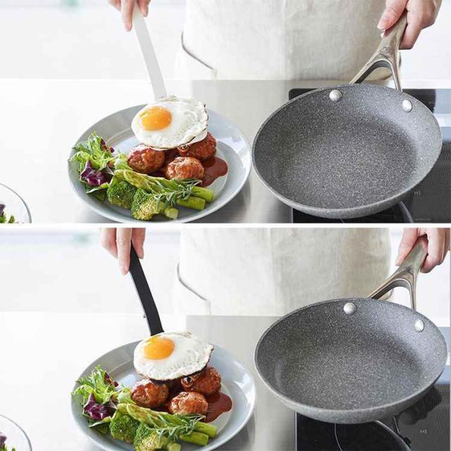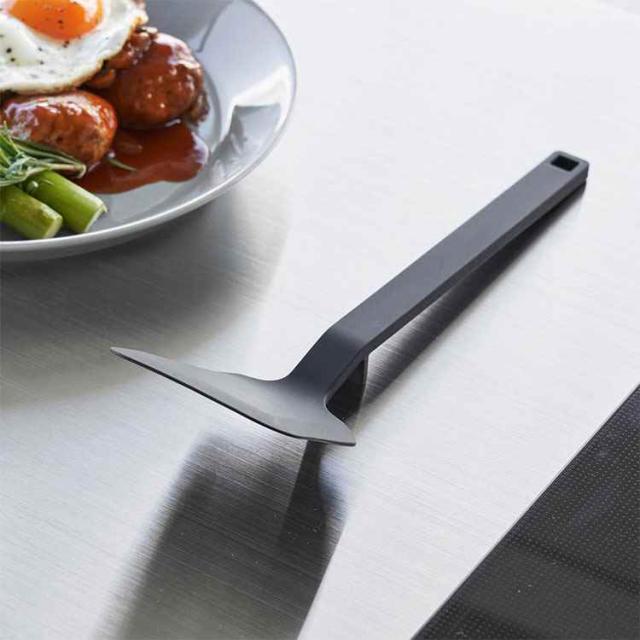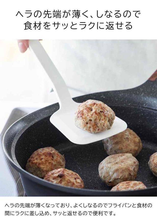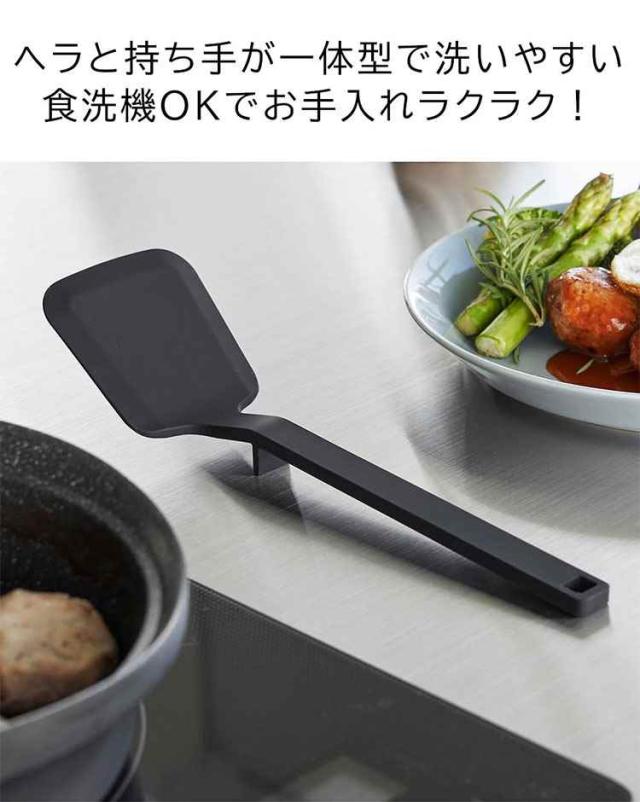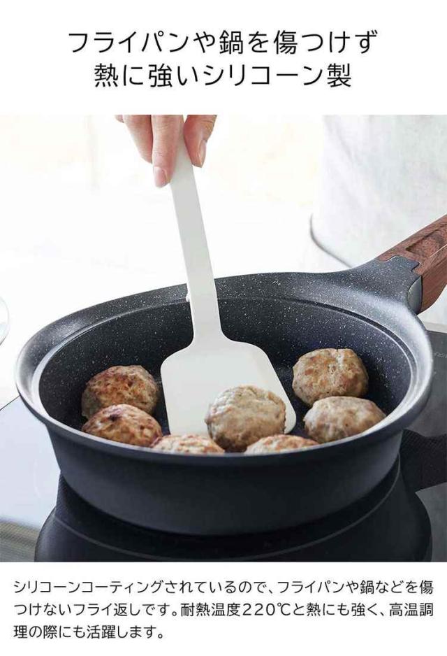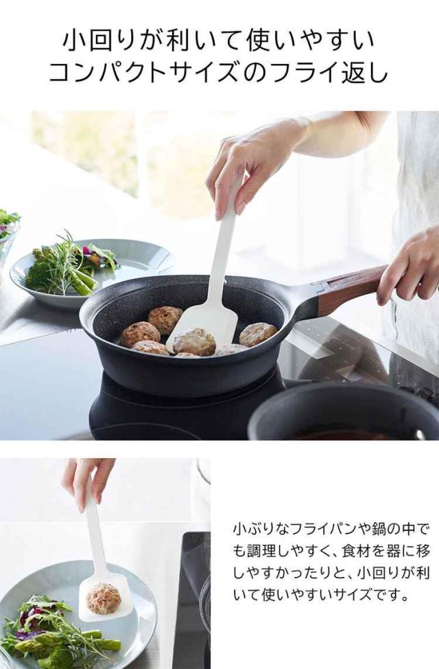 シリコーン製で滑りにくく熱に強い、コンパクトで使いやすいサイズのフライ返しです。シリコーンコーティングされているのでフライパン・鍋などをキズつけません。ヘラがしなるので食材をきれいに返せます。先端が浮くので直置きにならずに清潔。食洗機にも対応しています。