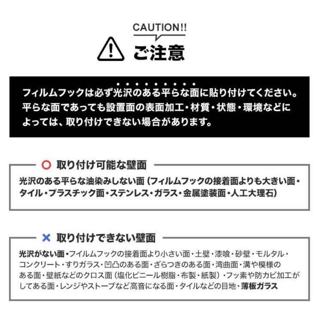 光沢のある平らな油染みしない面(フィルムフックの接着面よりも大きい面・タイル・プラスチック面・ステンレス・ガラス・金属塗装面・人工大理石)