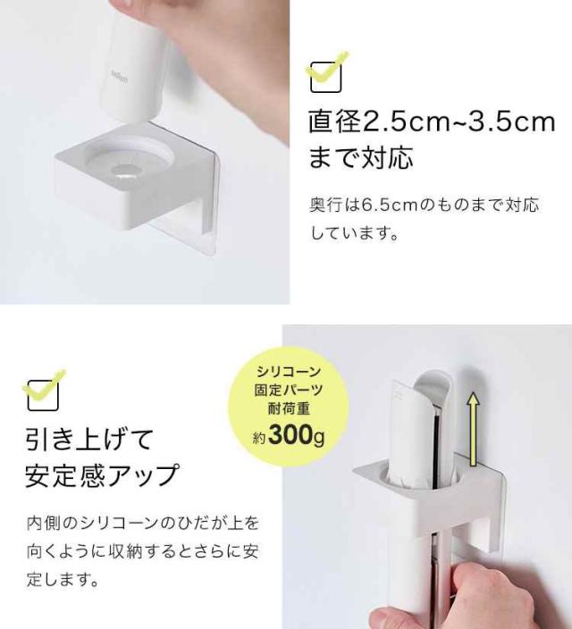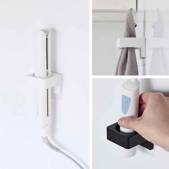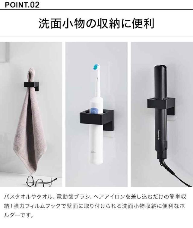 バスタオルやタオル、電動歯ブラシ、ヘアアイロンを差し込むだけの簡単収納!強力フィルムフックで壁面に取り付けられる洗面小物収納に便利なホルダーです。直径2.5cm〜3.5cmまで対応しています。2個使用すれば、電動歯ブラシの使い分けにも便利。